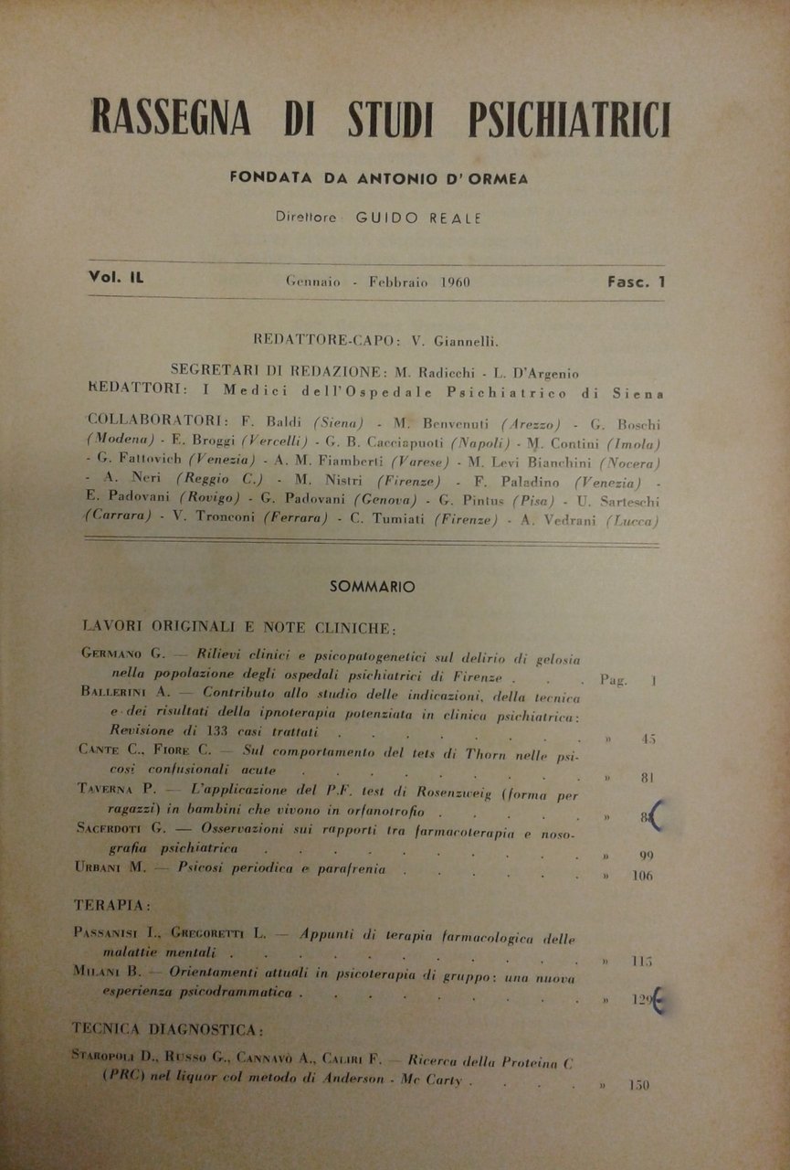 Rassegna di studi psichiatrici. Diretta da Antonio D'Ormea. Vol. IL - 1960