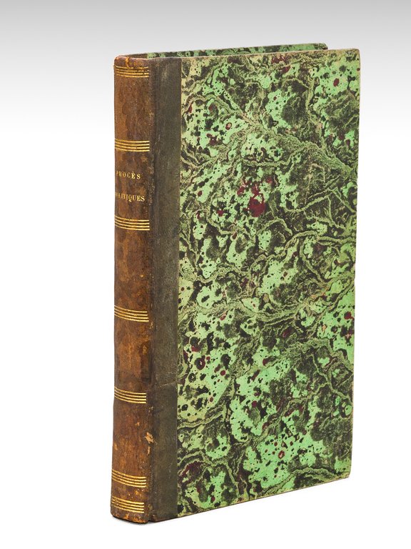 1 vol. in-8 reliure de l'époque demi-basane marron : Procès de M. le Comte de Kergorlay, suivi des Motifs de refus de Serment de MM. les Pairs et Députés à Louis-Philippe d'Orléans, Librairie d'Ed. Bricon, Paris, 1830, 100-4 pp. [avec les Notes adressées au Moniteur ] [Suivi de : ] Procès du Service Funèbre célébré le 14 février 1831, à Saint-Germain-l'Auxerrois. Accusation contre MM. Valerius, Durouchoux Fils, Boblet, Quinel et de Balthasar, Chez G. A. Dentu, Paris, 1831, 1 ff., XXI-128 pp. [ Suivi d'un manuscrit : ] A Mme Valerius, copie manuscrite signée et certifiée par Valérius de la lettre adressée par Lafiteur à sa femme, de Caen, le 25 avril 1831, 4 ff. [ Suivi de : ] Relation exacte de ce qui s'est passé le 14 février 1831, au service funèbre célébré pour le repos de l'âme de S.A.R. Monseigneur le Duc de Berri, dans l'église Saint-Germain-l'Auxerrois, deuxième tirage, imprimerie de G.-A. Dentu, Paris, 1831, 4 pp. [ Suivi d'un manuscrit : ] "Le gouvernement de Louis-Philippe est illégitime [. ] Voilà le gouvernement que vous vous êtes donné, ou plutôt qu'une poignée d'hommes sans mandat vous ont imposé", 1 f. [ Suivi de : ] Relation fidèle et détaillée de l'arrestation de S.A.R. Madame, Duchesse de Berry, Imprimerie de C. Merson, Nantes, Novembre 1832, 1 f., 40 pp. avec planche en frontispice et avec grande planche dépliante [ Suivi de : ] Dénonciation et Plainte judiciaire contre MM. les Présidens et Membres du Conseil des Ministres de Louis-Philippe, au sujet de la Détention et de la Séquestration de S.A.R. Madame, Duchesse de Berri, De l'Imprimerie de L. E. Herhan, Paris, Avril 1833, 16 pp. [ Suivi de : ] De la Situation de S.A.R. Madame, Duchesse de Berri, dans ses rapports avec sa constitution, et l'état sanitaire de la Citadelle de Blaye, par le Doctr Verneuil, Paris, Imprimerie de L. E. Herhan, 1833, 30 pp. [ Suivi de : ] Extrait de la Quotidienne du 19 mai 1833. Lettre du Comte de Kergorlay à M. le Ministre de la Presse, 1 f. lithographié [ Suivi de : ] Lettre du Comte de Kergorlay à M. le Ministre de la Guerre, Imprimerie de L. E. Herhan, 8 mai 1833, 7 pp. Ce recueil rassemble certaines pièces peu communes, dont deux manuscrits, le premier signé de Valerius, légitimiste accusé d'avoir provoqué la colère de la foule en participant à la "provocation" de l'accrochage d'une lithographie du Duc de Bordeaux lors du service funèbre de 1831 en l'honneur du Duc de Berry. Ce service dégénéra en émeute jacobine et se termina par le sac de l'église Saint Germain et du palais de l'archevêque. Habilement utilisés par Adolphe Thiers, sous-secrétaire d'Etat à l'intérieur, ces troubles contribuèrent au recours au "Parti de l'ordre" de Casimir Périer. Bon état (petit mq. en coiffe sup., bon exemplaire par ailleurs).