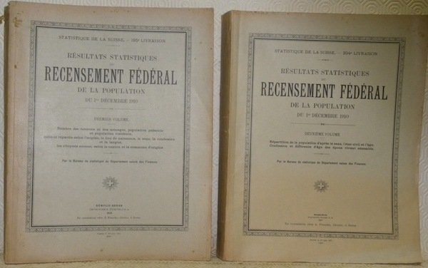Résultats statistiques du recensements fédéral de la population du 1er décembre 1910. Par le Bureau de statistique du Département suisse des Finances. Tome 1 et 2. I: Nombre des maisons et des ménages, population présente et population rédidente, celle-ci répartie selon l’origine, le lieu de naissance, le sexe, la confession et la langue, les citoyens suisses, selon le canton et la commune d’origine. II: Répartition de la population d’après le sexe, l’état civil et l’âge. Confession et différence d’âge des époux vivant ensemble.