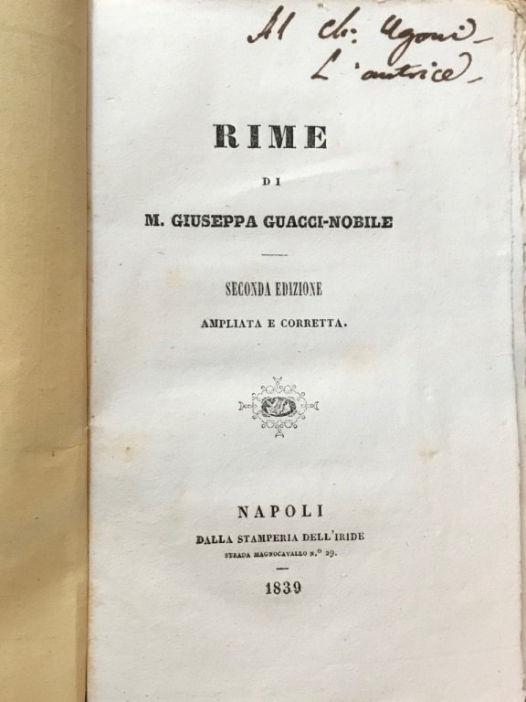 <span style="font-style: normal;">In-16° (cm. 18,4), brossura editoriale a stampa (minime fioriture); pp. [4] 174 [2] in barbe e in ottimo stato; dedica autografa della poetessa al letterato Camillo Ugoni al frontespizio. Romantica napoletana, la Guacci pubblicava la prima edizione della </span><i>Rime</i> nel 1832, presso Fibreno, seguita da questa seconda del 1839 presso la Stamperia dell'Iride, e una terza nel 1847, stesso editore, accresciuta e in due volumi. Ottimo esemplare d'illustre provenienza. (SC1)