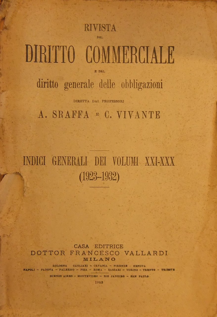 Rivista del Diritto Commerciale e del diritto generale delle obbligazioni. Diretta da A. Sraffa e C. Vivante. Indice generale dei volumi XXI-XXX (1923-1932) | Libros antiguos y modernos | Autori Vari