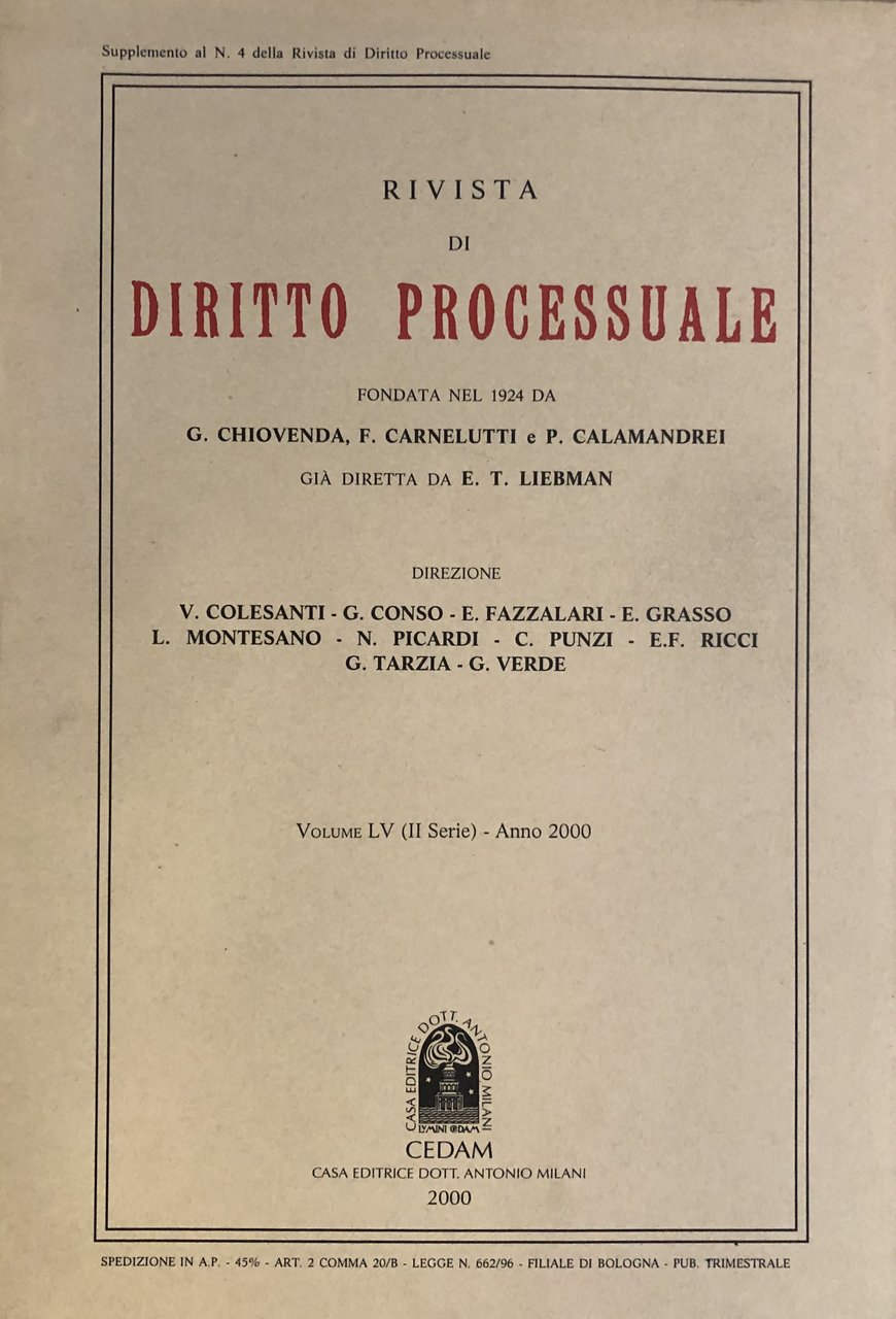 Rivista di Diritto Processuale. Annata 2000. Diretta da: Francesco Carnelutti, Giuseppe Chiovenda, Piero Calamandrei, Enrico Tullio Liebman. Anno LV (Seconda Serie)