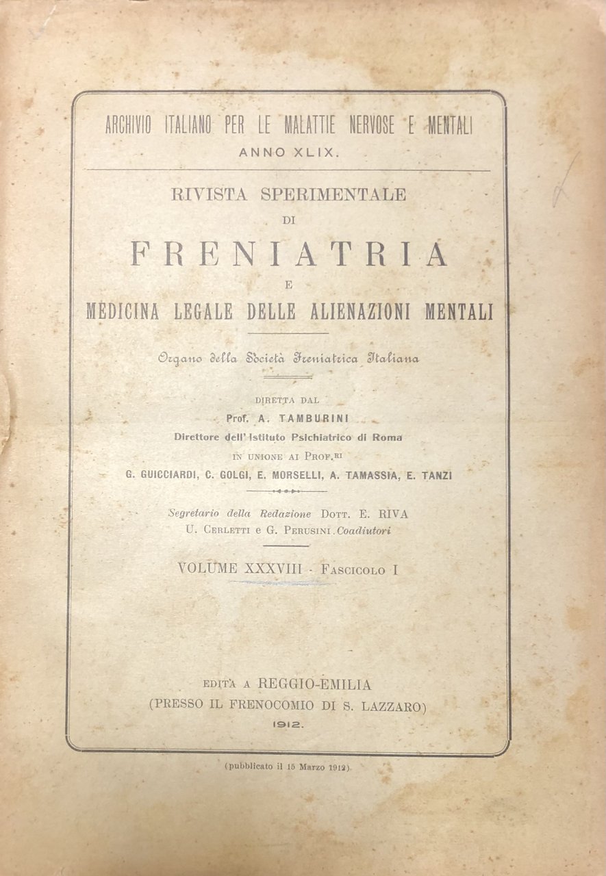 Rivista sperimentale di freniatria e di medicina legale delle alienazioni mentali. Organo della società freniatrica italiana. Vol. XXXVIII - Anno 1912 | Libros antiguos y modernos | Autori Vari