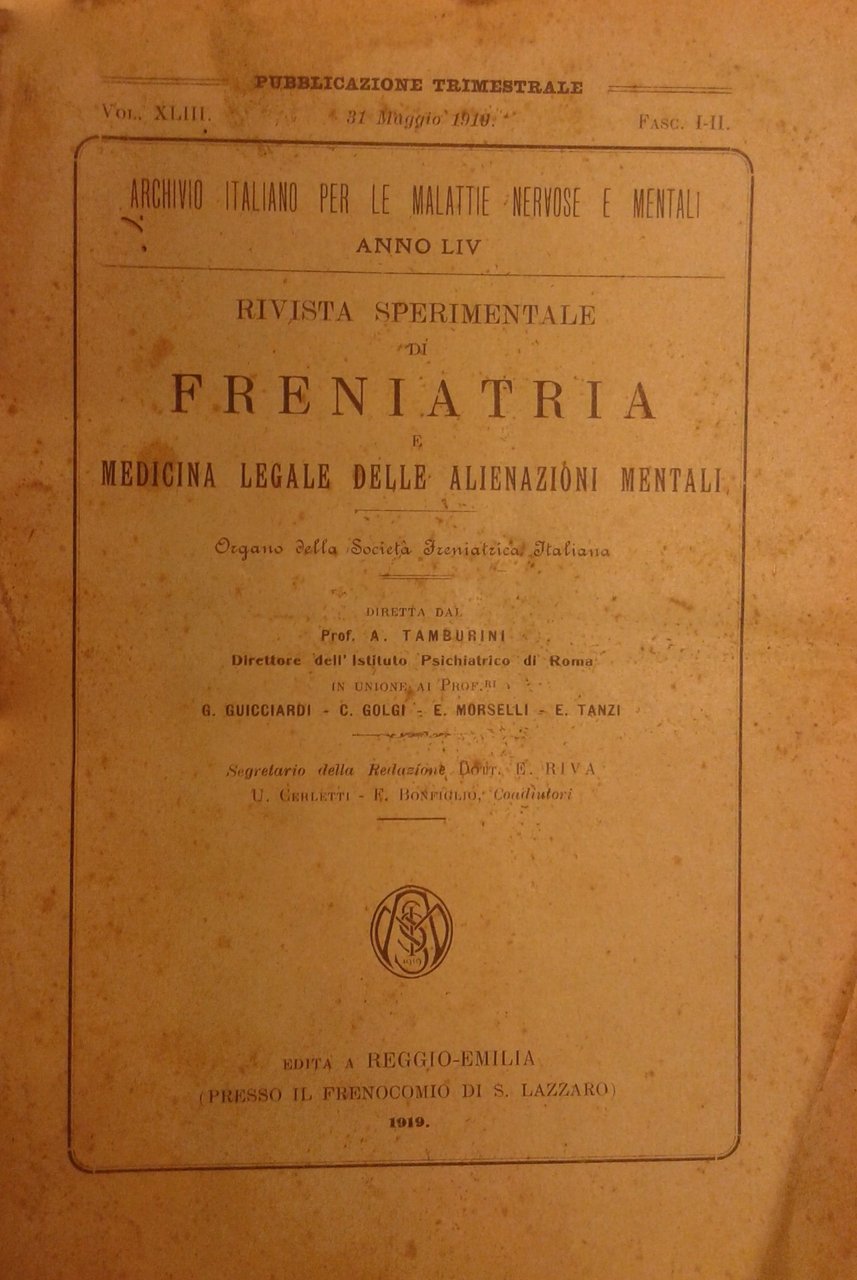 Rivista sperimentale di freniatria e di medicina legale delle alienazioni mentali. Organo della società freniatrica italiana. Vol. XLIII - Anno 1919 | Libros antiguos y modernos | Autori Vari