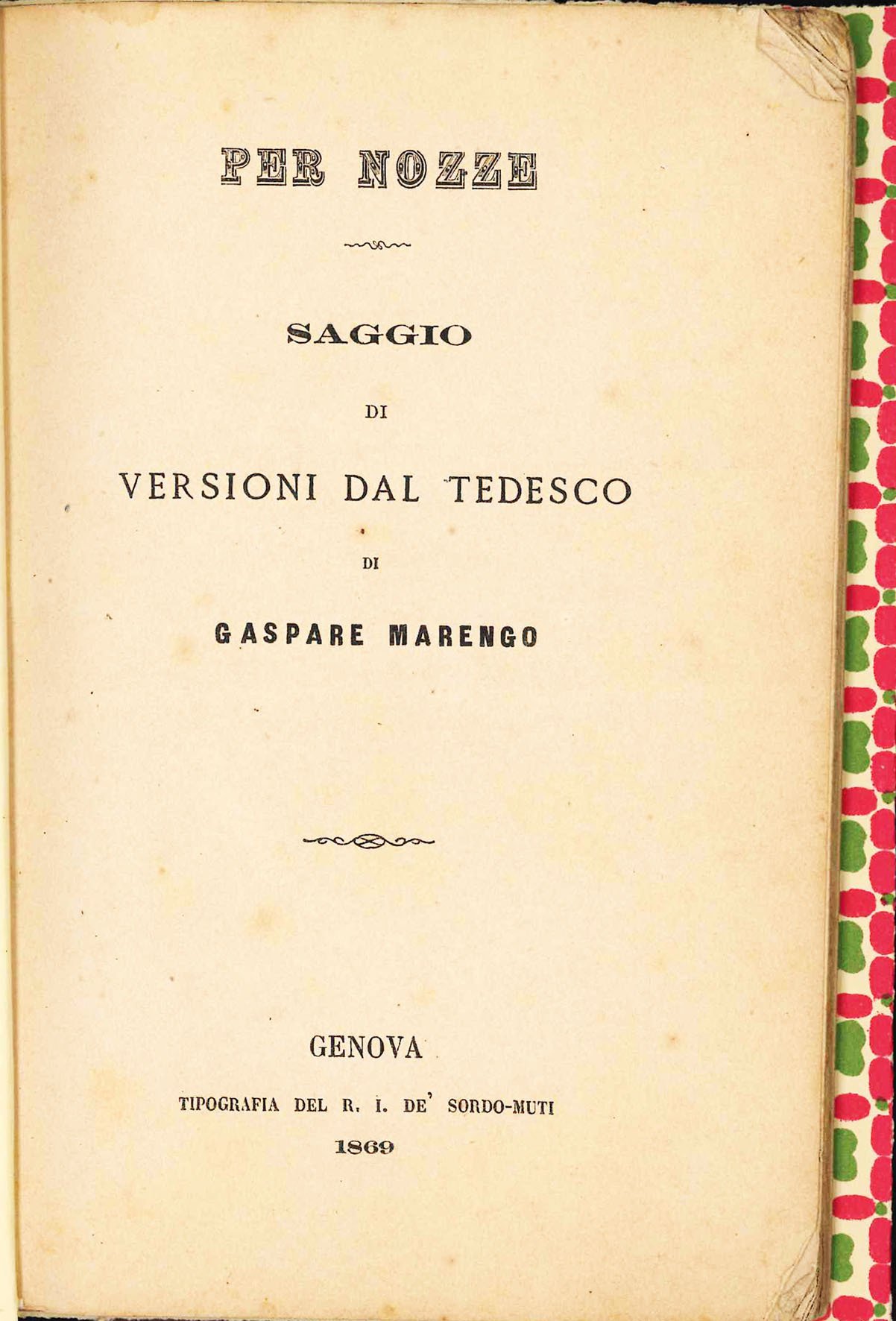 Mm. 175 x 110. Pp. 54, [2]. Brossura moderna, leggermente brunita e con fioriture. Dedica dell'autore all'amico Antonio Cerruti, in occasione delle sue nozze con la gentile e colta donzella Paola Schiaffino. Segue la traduzione di diversi componimenti dalla poesia tedesca: