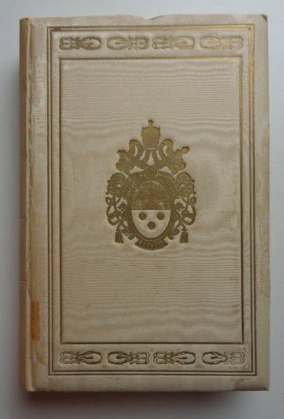 Un volume (12x18,5 cm) di VIII-301 pagine. Legatura in tutta seta bianca, doppia cornice dorata ai piatti con al centro di quello anteriore lo stemma dorato di PAPA PIO XI. Risguardie di carta con gigli dorati e dentelle dorata; tagli dorati. Traccia di etichetta, qualche minima usura al margine, peraltro condizioni molto buone.
