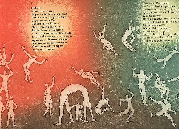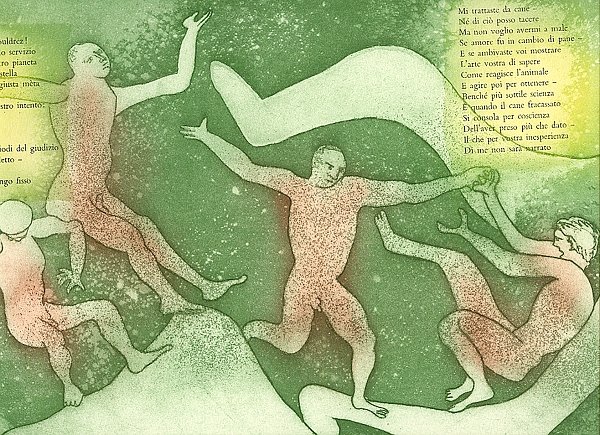 Cartella a 6 fogli sciolti con 10 poesie in prima edizione stampate su carta India e incollate su 5 acqueforti acquetinte a colori originali di Enrico Baj, numerate e firmate a matita (cm 25x40). Una nota di Giovanni Giudici Stampato su carta Arches. Edizione numerata e firamta dagli Autori. 4to (cm 31,5x45,5). pp. 6. . Ottimo (Fine). . Prima edizione di 99+XXVI es. numerati e firmati. .
