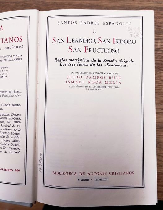 Santos Padres españoles II: San Leandro, San Isidoro, San Fructuoso. Reglas monásticas de la España visigoda. Los tres libros de las "Sentencias". Introducciones, versión y notas de Julio Campos Ruiz e Ismael Roca Meliá.