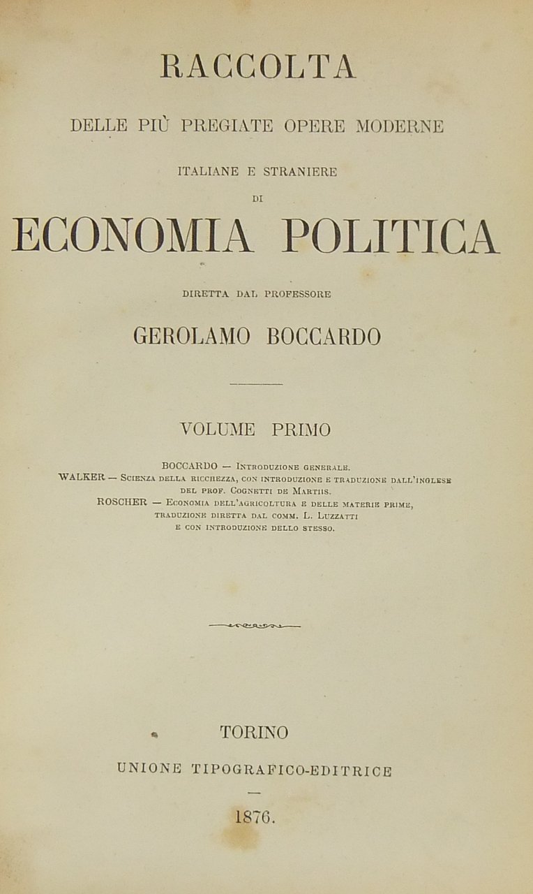 Scienza della ricchezza (Walker). Con introduzione e traduzione dall'inglese di Cognetti De Martiis. Economia dell'agricoltura e delle materie prime (Roscher). Traduzione diretta da L. Luzzatti e con introduzione dello stesso. Introduzione generale di Gerolamo Boccardo