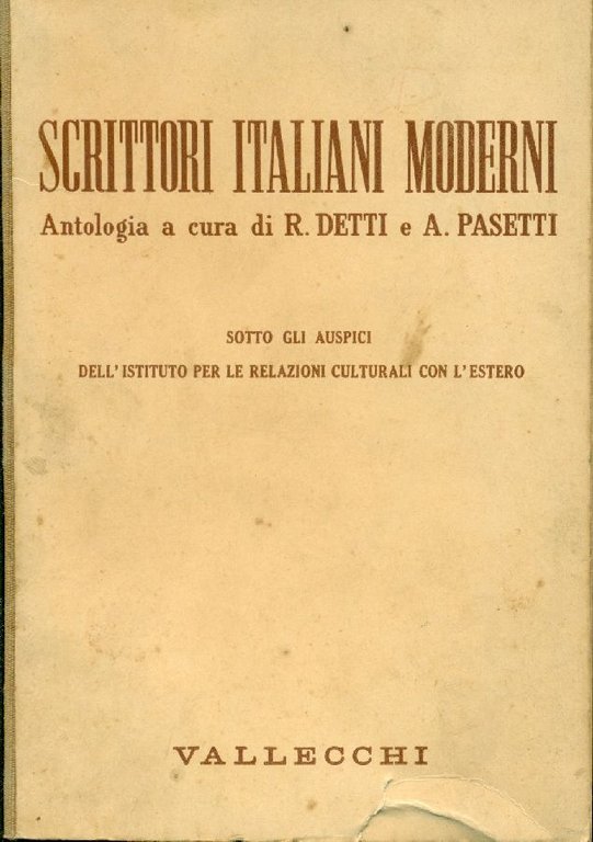 Sotto gli auspici dell'Istituto per le Relazioni Culturali con l'Estero. Cenni biobibliografici e brani di Papini, Palazzeschi, Cecchi, Pancrazi, Monelli, Verga, Carducci, Montale, et al. . 16mo. pp. 268. . Buono (Good). . . .