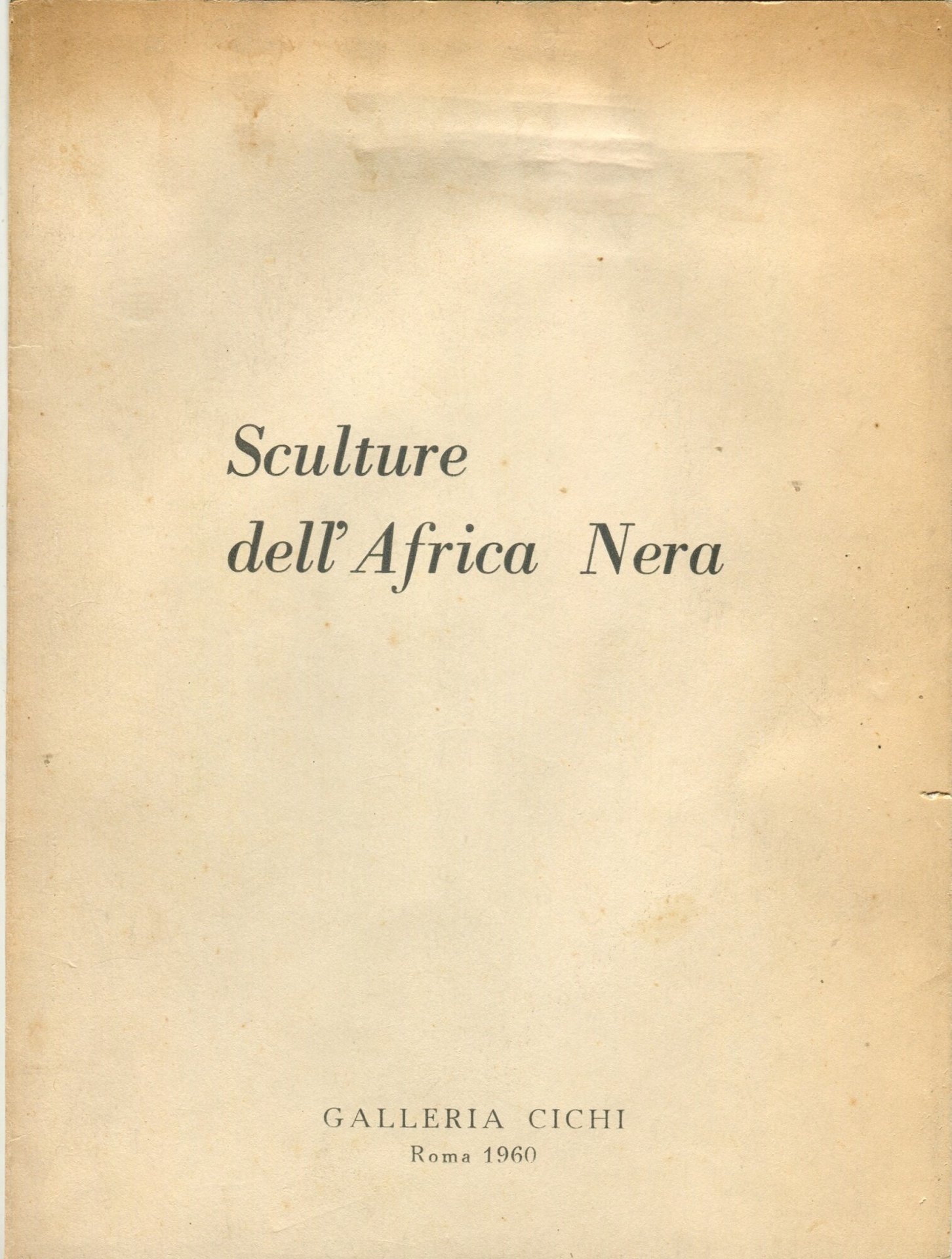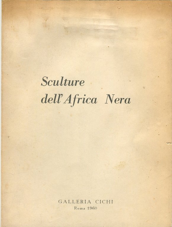 Catalogo di mostra, realizzata in collaborazione con il Museo Reale del Congo Belga di Tervuren, Roma, Galleria Cichi 1960. Una poesia di Bernard B. Dadiè ("Ti ringrazio Mio Dio") e testi di Italo Cichi ed Ernesta Cerulli (Università di Roma). Presentazione degli stili di scultura: Bambara, Senufo, Baulè, Curo, Wobe, Yoruba, et. al. Lista delle opere e tavole in bianco e nero . Cm 20,5x15,5. pp. 44. . Molto buono (Very Good). Copertina brunita ai margini (Cover sunned at the edges). . .