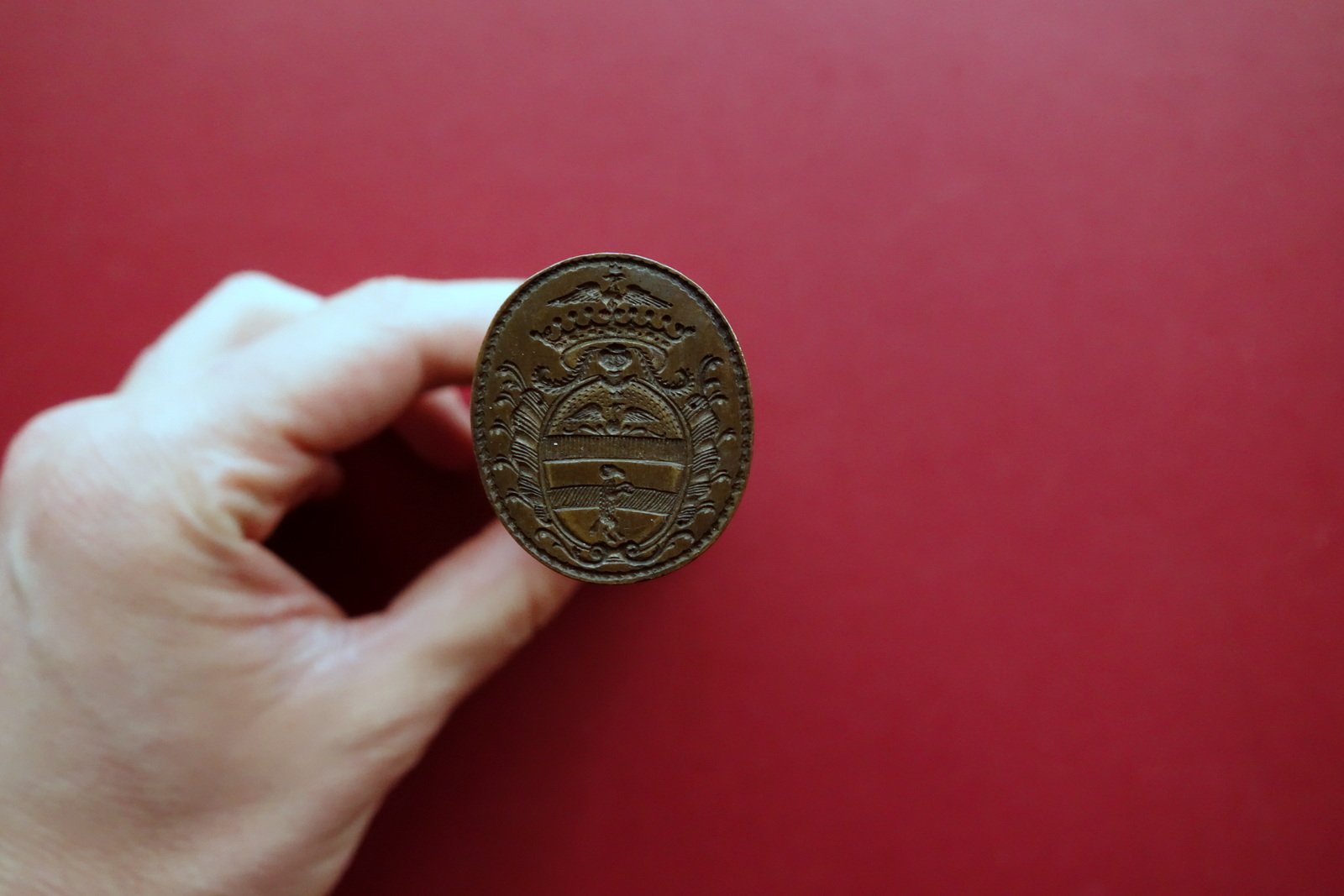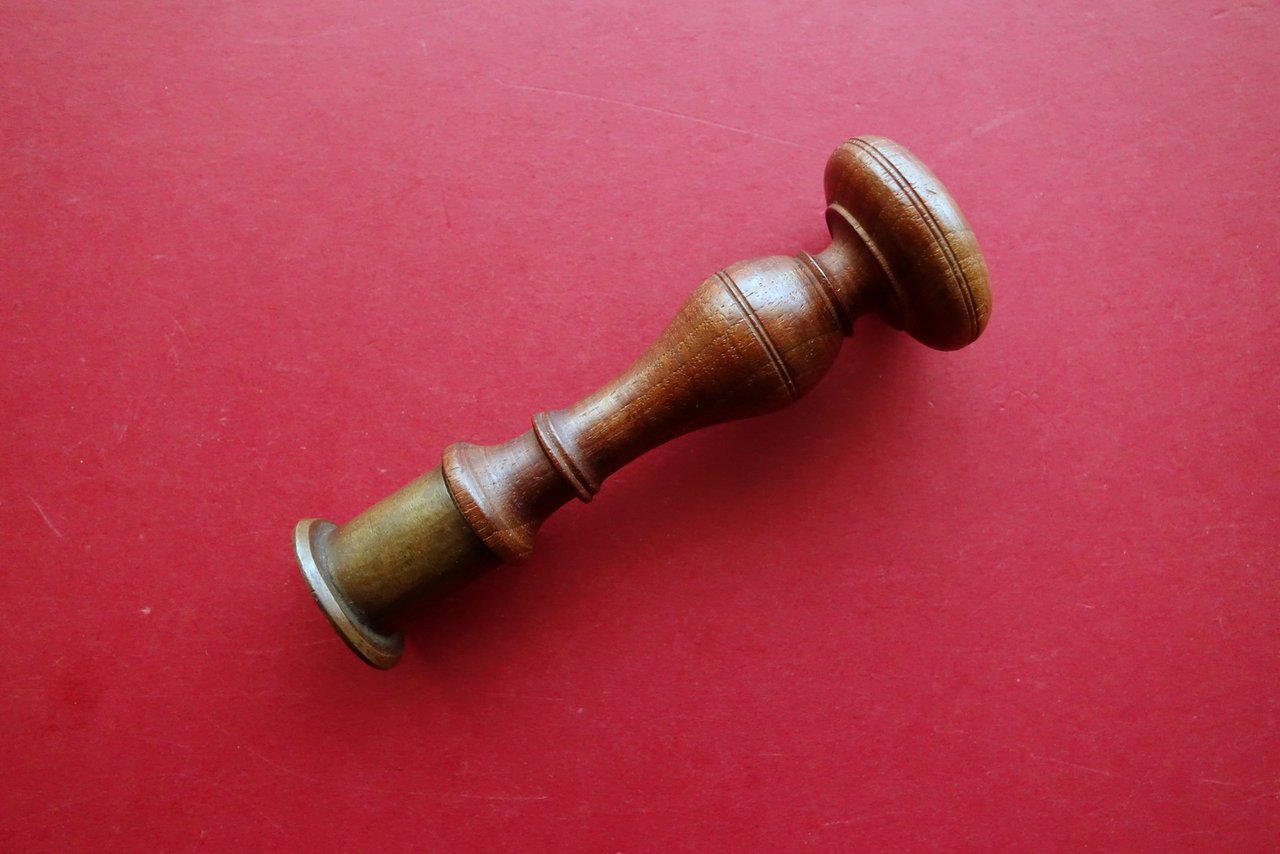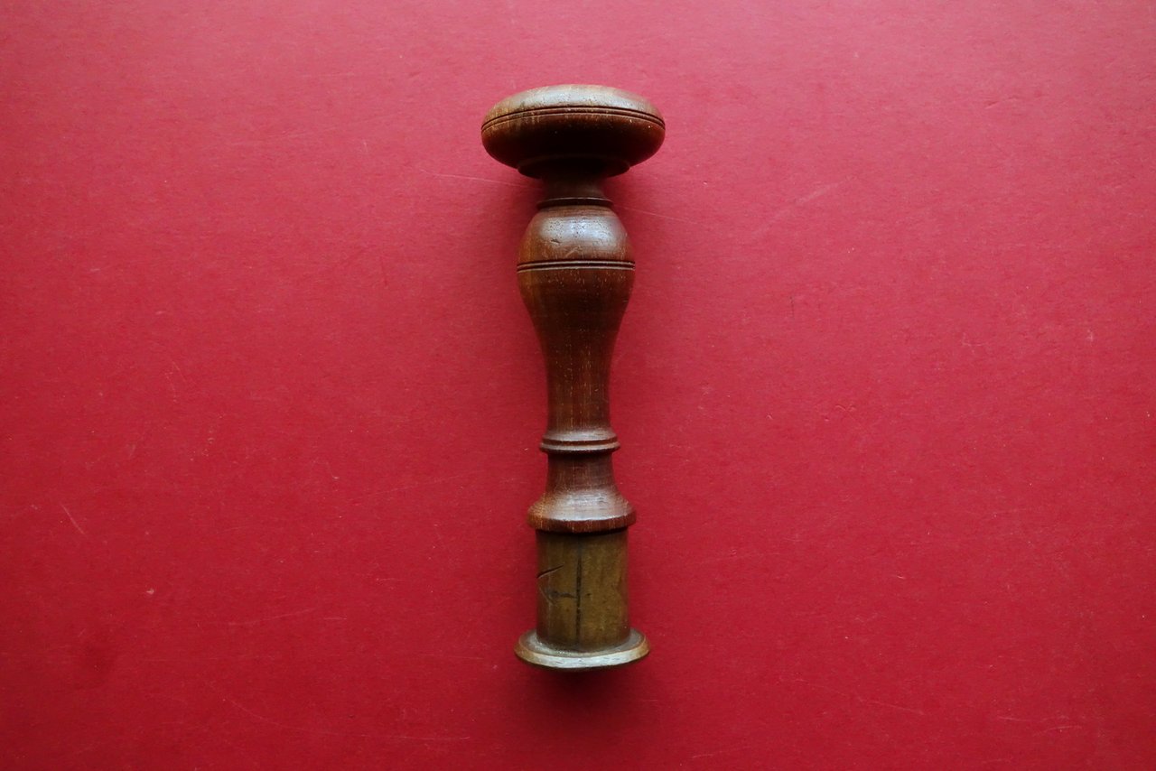 Sigillo - timbro per chiusura con ceralacca, con stemma araldico inciso, Sigillo - timbro per chiusura con ceralacca con stemma araldico inciso prima metà dell'Ottocento circa S. d. (prima metà dell'Ottocento circa); bel sigillo - timbro d'epoca per chiusura in ceralacca, parte terminale in bronzo con stemma araldico inciso, manico in legno sagomato. Dimensioni: altezza cm 12, larghezza cm 3, profondità cm 2,5. Condizioni di conservazione Complessivamente molto ben conservato con minimi segni del tempo. Per ulteriori dettagli vedi foto. Molto bello. Di ottima fattura. SC04.D0435 N