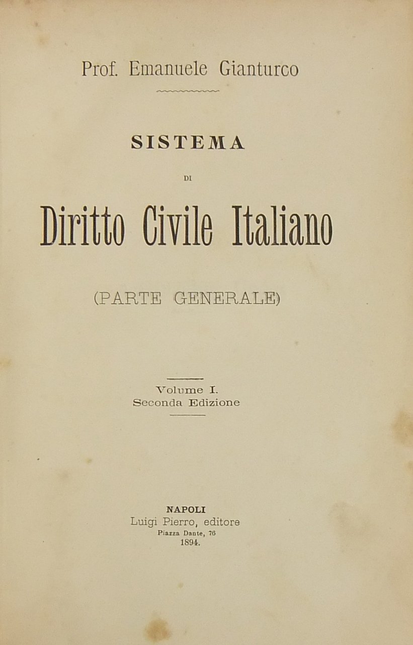 Sistema di Diritto Civile Italiano. Vol. I - Parte generale (unico pubblicato) | Libros antiguos y modernos | Gianturco Emanuele (1857-1907)