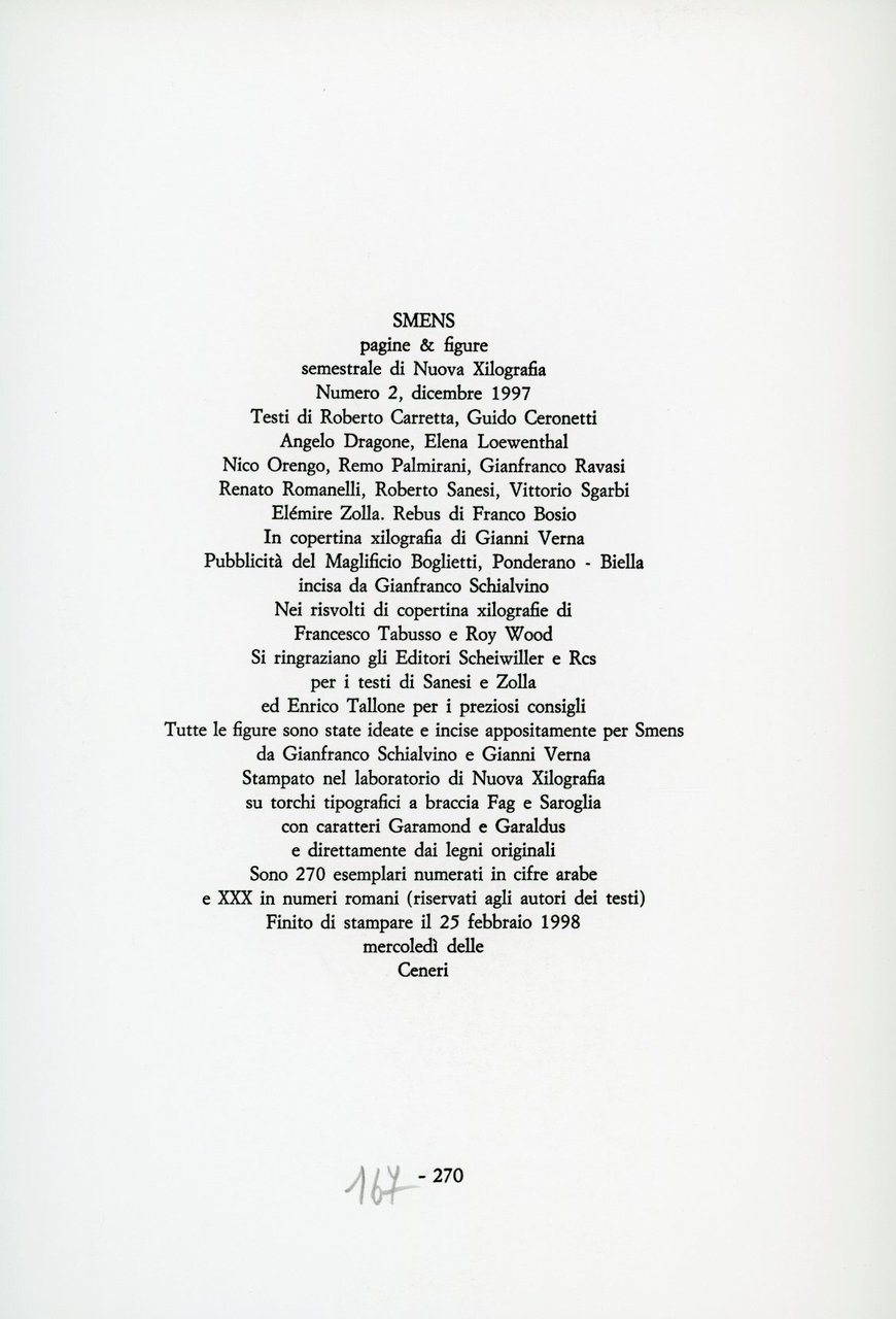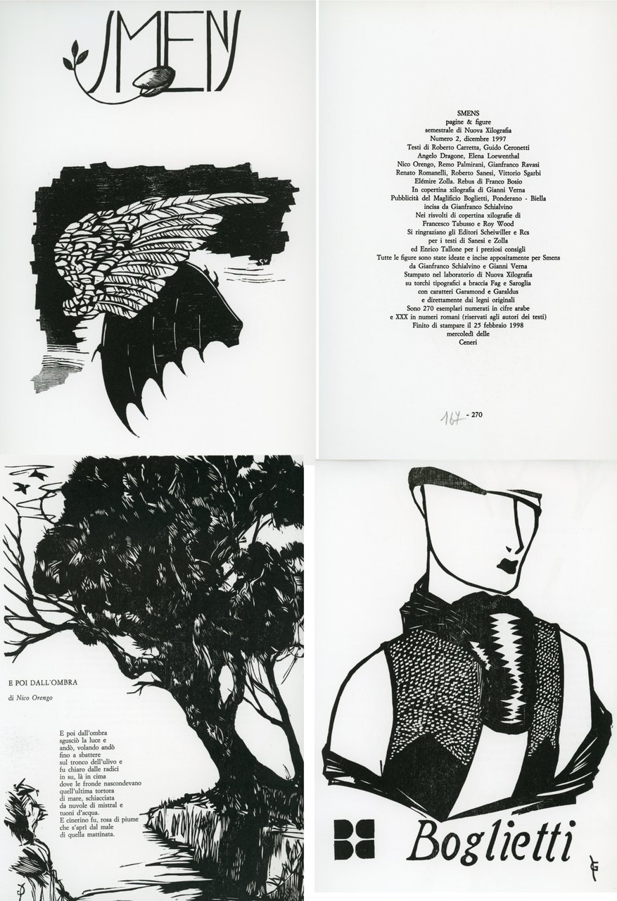 Testi di Roberto Carretta, Angelo Dragone, Elena Loewenthal, Gianfranco Ravasi, Roberto Sanesi, Elémire Zolla ed altri. Illustrato con numerose xilografie in nero, anche a piena e doppia pagina, ideate e incise appositamente per Smens da Gianfranco Schialvino e Gianni Verna . Quelle sul risvolto di copertina sono di Francesco Tabusso e Roy Wood Copertina di Gianfranco Schialvino. Stampato nel laboratorio di Nuova Xilografia a Ozegna e Rivarolo Canavese, Torino, sui torchi tipografici a braccia Fag e Saroglia con caratteri Garamond e Garaldus e dai legni originali. 4to. pp. 6 quartini sciolti. . Ottimo (Fine). . Prima edizione di 270 + XXX es. numerati. .