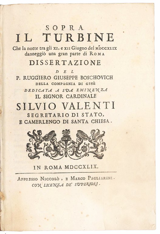 Sopra il turbine che la notte tra gli XI, e XII Giugno del MDCCXLIX danneggiò una gran parte di Roma dissertazione del P. Ruggiero Giuseppe Boschovich della Compagnia di Gesù [...]
