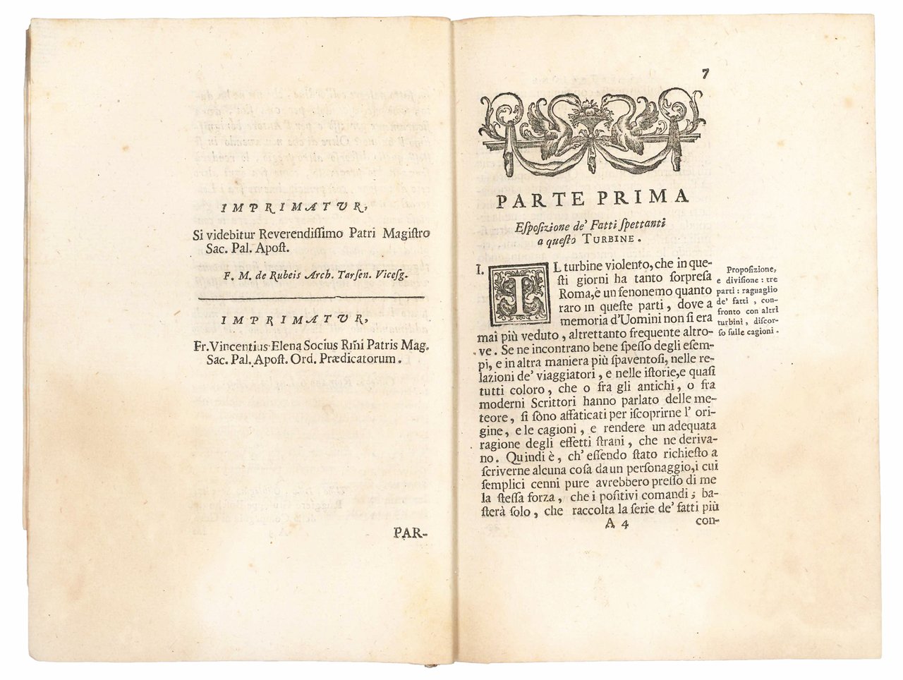 First edition of this scientific text in which the author describes the damage caused to Rome by a tornado that struck the city on the night of 11-12 June 1749, and analyses the movement and characteristics of tornadoes in terms of Stephen Hales' theory of “fixed air”.
