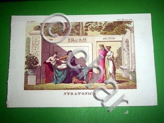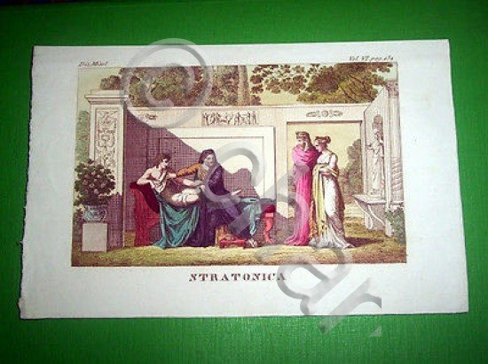 *** Stampa / incisione d' epoca Mitologia - STRATONICA - tavola estratta dal volume, databile 1700 ca. Dimensioni stampa cm. 10,8 x 17,4 / Dimensioni dell' intero foglio cm. 14,5 x 22,8 circa Per appassionati, studiosi e collezionisti