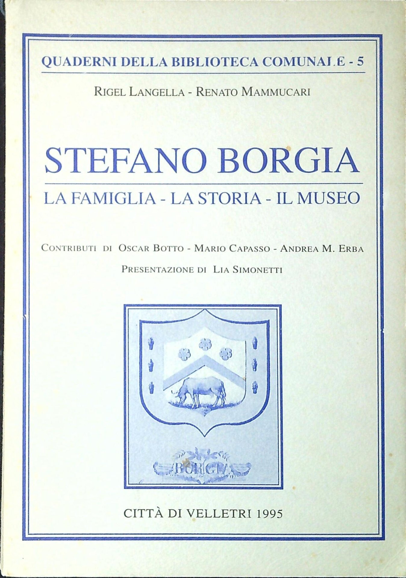 Langella, Rigel; Mammuccari, Renato Stefano Borgia. La famiglia-la storia-il museo. Velletri, Biblioteca comunale 1995, ill. 24 cm. 141 p. (16487)