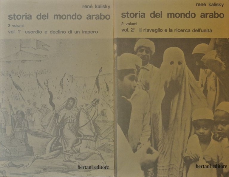 Opera in due volumi. Edizione italiana a cura di Filiberto Preto. Traduzioni di Filiberto Preto, Tina e Maurizio Ballini, Antonio Pischedda. Volume I: L'Arabia Preislamica (L'isola araba - Il crogiolo del deserto - I sentieri di una nazione - I sentieri dell'Islàm - L'Arabia preislamica nella storia) - Maometto (Maometto, il sigillo dei profeti - Il Corano, il libro inimitabile) - Nascita di un impero (La conquista araba - Il mondo musulmano dopo la conquista - L' Islàm ufficiale di fronte ai movimenti settari - L'impero sotto gli Abbàssidi - La vita sociale nei paesi dell'Islàm) - Le crociate ( L'impero si smembra - Le crociate - Saladino e la liberalità dell'Islàm) - Il declino (L'invasione mongola e le ultime dinastie - Gli ultimi fuochi - Il crepuscolo arabo: un interludio di quattro secoli) - La civiltà (Che cosa è stata la civiltà arabo-islamica ). Volume II: Da Napoleone alla prima guerra mondiale (Rimedi per un mondo malato - Fortuna e sfortuna di una resurrezione) - Le mani sull'Europa (La prima guerra mondiale e la rinascita politica del mondo arabo - La tutela dell'Occidente - La seconda guerra mondiale - La creazione dello stato d'Israele - I movimenti di liberazione - La lunga marcia del panarabismo) - Dopo Suez ( Dopo Suez - I conservatori contro i progressisti - Il tracollo del nasserismo o la guerra dei sei giorni - Fra due rivoluzioni) - Appendice (Dove vanno gli arabi). Orientamento bibliografico - Elenco delle illustrazioni - Indice delle carte geografiche. Dieci carte geografiche ed alberi geneaologici e 45 illustrazioni in b/n fuori testo. . 8vo. pp. 349 (vol. I) - pp. 453 (vol. II). . Molto buono (Very Good). Pagine brunite ai margini (Pages slightly browned to edges), custodia riparata, leggermente sporca e con mende (Lightly soiled and repaired slip case). Prima edizione (First Edition). .
