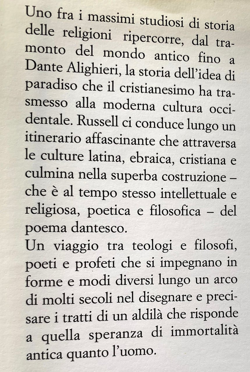 Uno fra i massimi studiosi di storia delle religioni ripercorre, dal tramonto del mondo antico fino a Dante Alighieri, la storia dell'idea di paradiso che il cristianesimo ha trasmesso alla moderna cultura occidentale. Russell ci conduce lungo un itinerario affascinante che attraversa le culture latina, ebraica, cristiana e culmina nella superba costruzione che è al tempo stesso intellettuale e religiosa, poetica e filosofica del poema dantesco.
