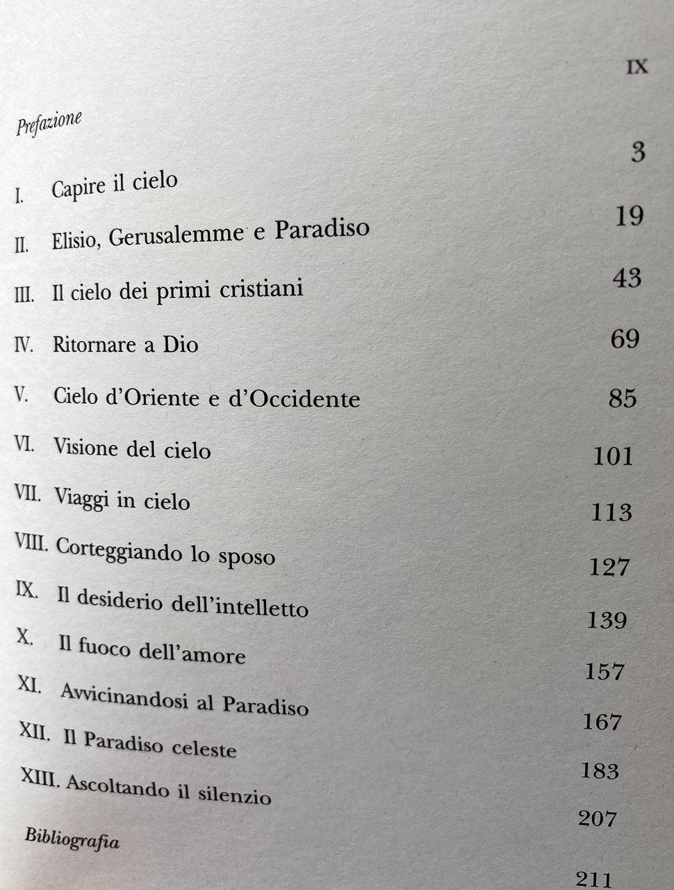 Prefazione – I. Capire il cielo – II. Elisio, Gerusalemme e Paradiso – III. Il cielo dei primi cristiani – IV. Ritornare a Dio – V. Cielo d'Oriente e d'Occidente – VI. Visione del cielo – VII. Viaggi in cielo – VIII. Corteggiando lo sposo – IX. Il desiderio dell'intelletto – X. Il fuoco dell'amore – XI. Avvicinandosi al Paradiso – XII. Il Paradiso celeste – XIII. Ascoltando il silenzio – Bibliografia