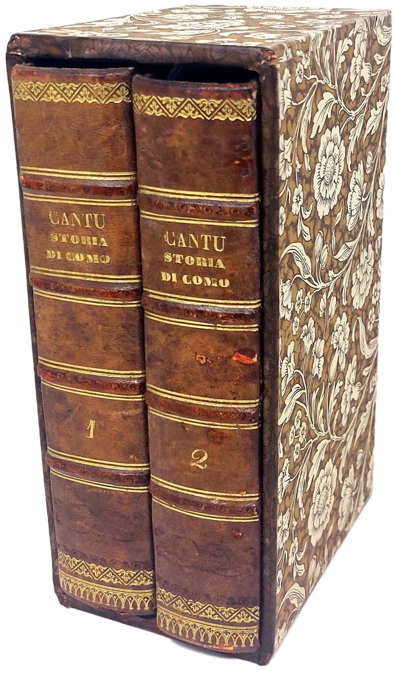 >2 vol. in-16, pp. 555, (3), (29, con indice ed ''Elenco degli associati''); attraente legatura del tempo m. pelle, dorsi a nervi con titolo e fregi in oro al dorso. Con una bella veduta del duomo di Como più volte ripiegata f.t. disegnata ed incisa all'acquatinta da Dom. Bonatti. Prima edizione, non comune, di quest'opera ''frutto maggiore'' del periodo trascorso dal Cantù a Como. Pur improntata a quella precedente di Carlo Ravelli, l'opera ha ''un ambito territoriale più esteso perché include tutta la diocesi comasca e quindi anche la Valtellina e il Ticino''. (DBIt. Vol.18, p. 337). Bell'esemplare, in elegante astuccio (minime fioriture sparse). Cat. Meneghina 953; Lozzi 1294 (ediz. 1856); Cat Platneriana 113.