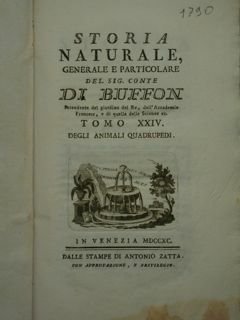 Storia Naturale, generale e particolare del Sig. Conte BUFFON intendente del giardino del Re, dell'Accademia Francese, e di quella delle Scienze ec. Tomo XXIV degli animali quatrupedi.