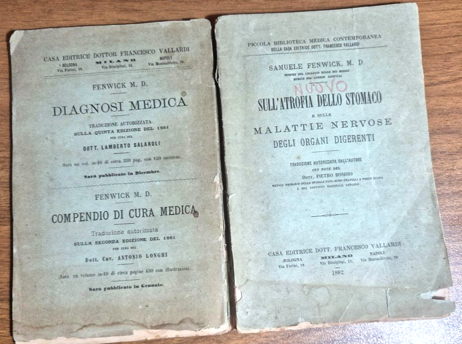 SULL'ATROFIA DELLO STOMACO E SULLE MALATTIE NERVOSE DEGLI ORGANI DIGERENTI di Samuele Fenwick M.D. Traduzione autorizzata dall'autore con note del Dott. Pietro Bosisio. Casa Editrice Dott. Francesco Vallardi, Piccola Biblioteca Medica Contemporanea, 1882. XVII, 186 Pagine. Copertina editoriale in brossura. Stato di conservazione: buono (pagine ingiallite, copertina usurata con piccole mancanze).