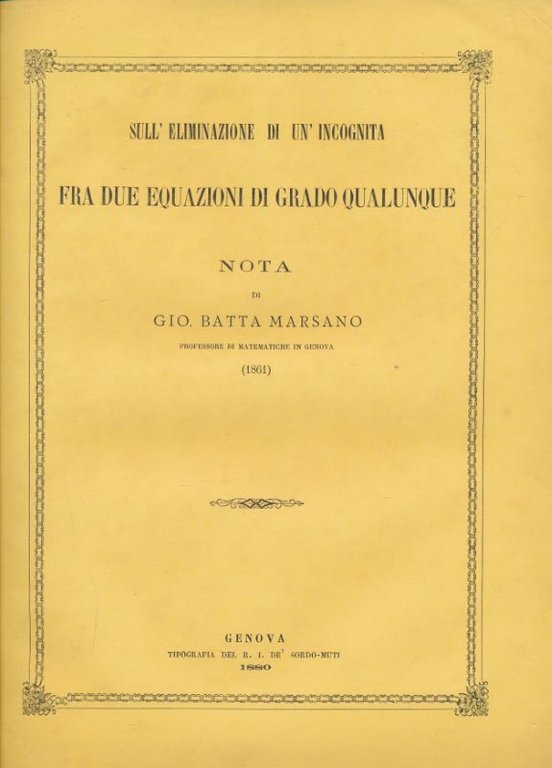 Sull' eliminazione di un'incognita fra due equazioni di grado qualunque | Libros antiguos y modernos | Marsano Gio. Batta
