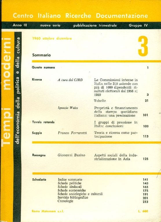 Sommario: Le Commissioni interne in Italia nelle 310 aziende con più di 1000 dipendenti: risultati elettorali del 1956 al 1959 - Proprietà e finanziamento della stampa quotidiana italiana: una precisazione (Ignazio Weiss) - I gruppi di pressione in Italia: conclusioni - Teoria e ricerca come partecipazione (Franco Ferrarotti) - Aspetti sociali della industrializzazzione in Asia . 8vo. pp. 228. . Molto buono (Very Good). . Anno III - Nuova serie. .