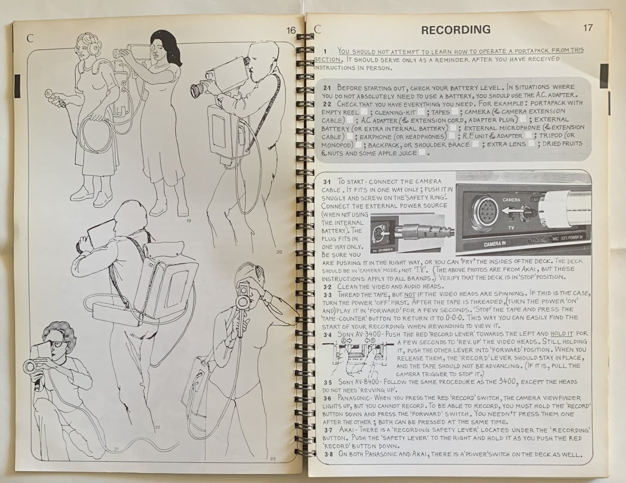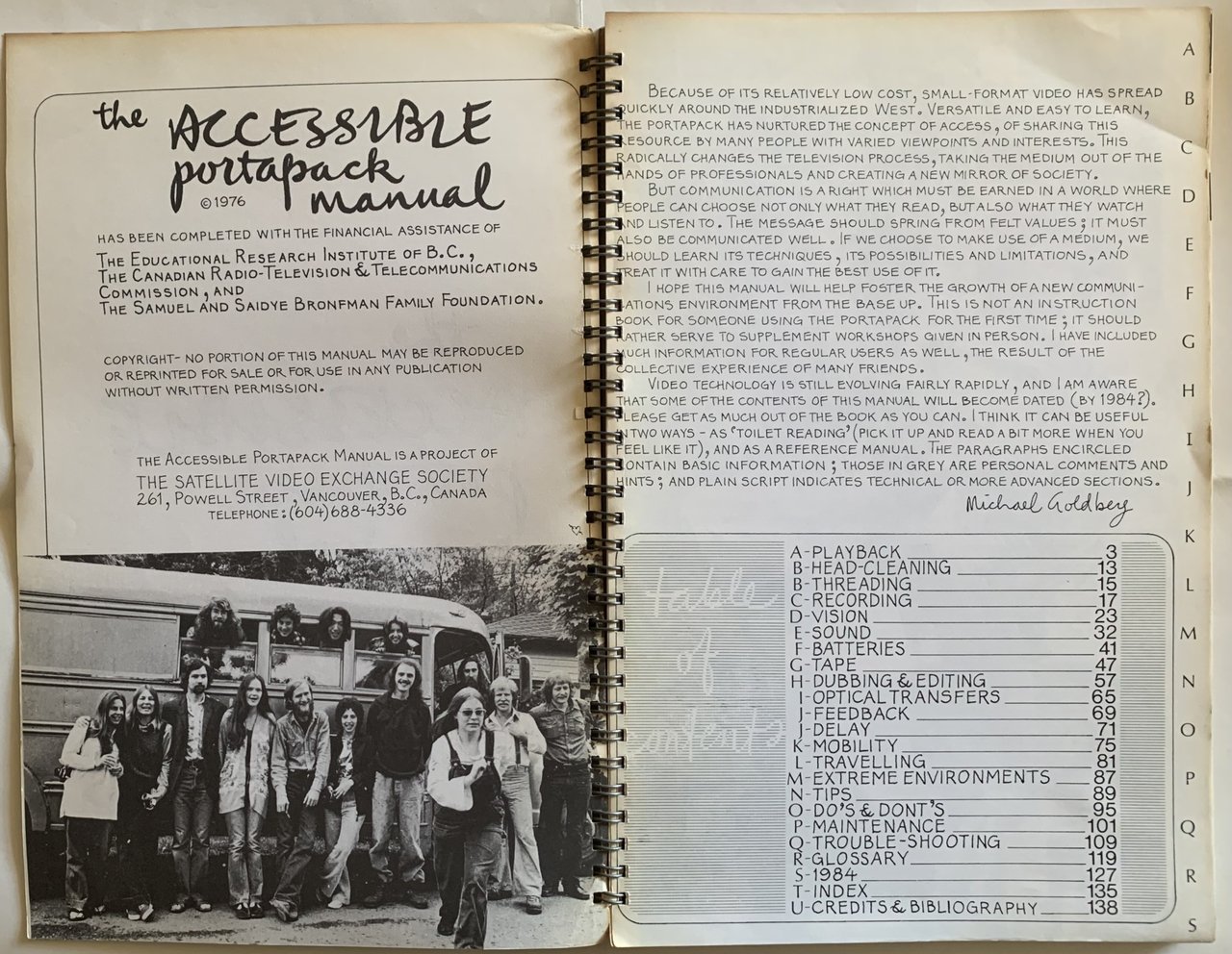 "Grazie al suo costo relativamente basso, il video in formato ridotto si è diffuso rapidamente nei paesi industrializzati occidentali. Versatile e facile da imparare, il portapack ha alimentato il concetto di disponibilità e condivisione di questa risorsa da parte di molte persone con punti di vista e interessi diversi. Ciò cambia radicalmente il processo televisivo, sottraendo il mezzo dalle mani dei professionisti e creando un nuovo specchio della società [...] La tecnologia video è ancora in rapida evoluzione e sono consapevole che alcuni dei contenuti di questo manuale diventeranno obsoleti (entro il 1984?). Vi invito a trarre il massimo da questo libro. Penso che possa essere utile in due modi: come “lettura da bagno” (prendetelo e leggetene un po' quando ne avete voglia) e come manuale di riferimento". (dall'introduzione di Michael Goldberg).