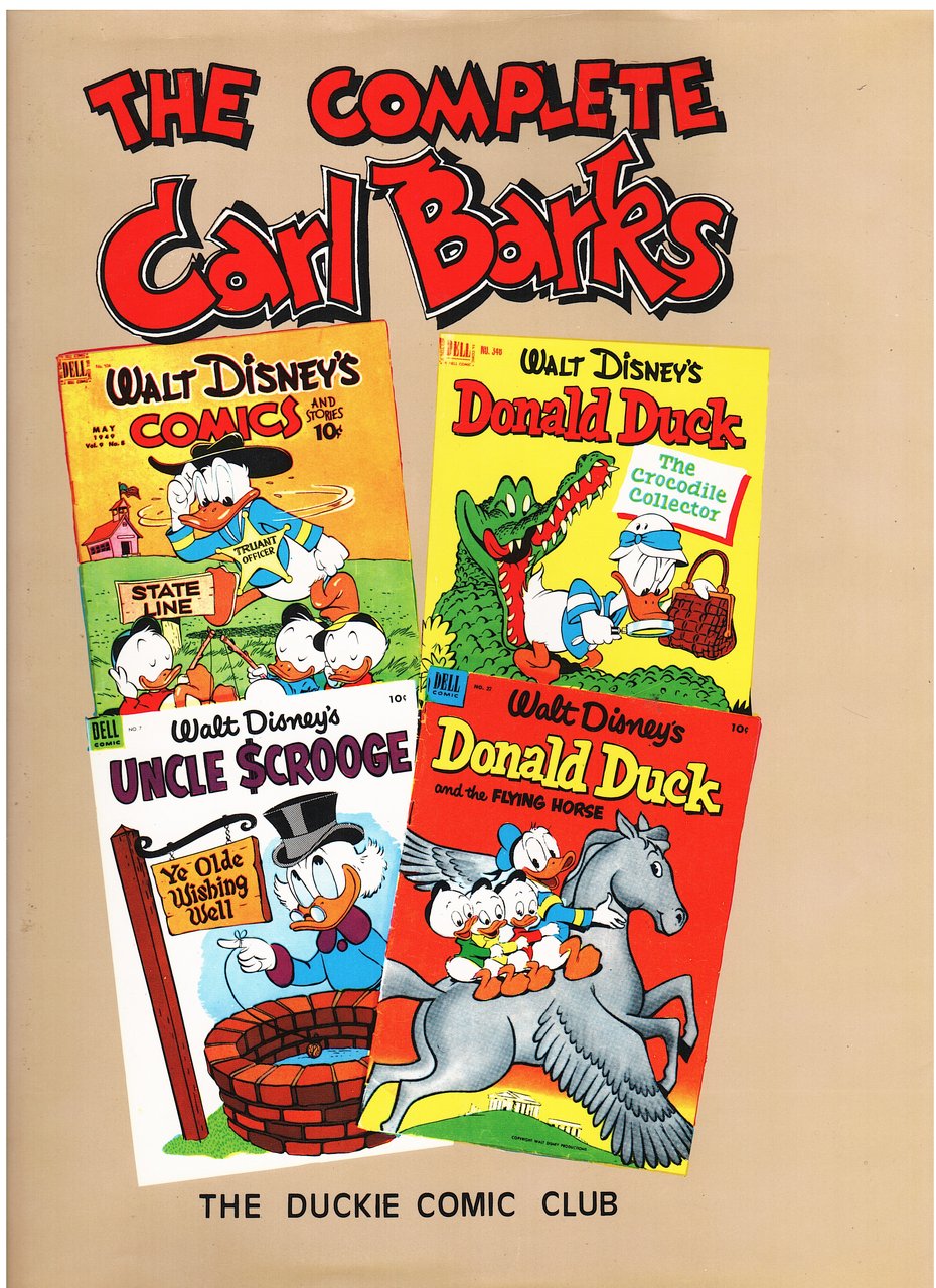 Collana completa di 33 numeri in similpelle edit. con tit. al piatto, sovrac. figurate, che propone per la prima volta l'opera disneyana di Carl Barks ed è pubblicata da un anonimo editore amatoriale "The Duckie Comic Club".Anni dopo la conclusione della serie, esce, senza indicazione di data e di prezzo, il volume 33, più ampio e misto a colori e bianco/nero. Presenta materiale all'epoca in gran parte inedito, come illustrazioni, vignette, sceneggiature, storyboard per film d'animazione, un'ampia selezione di quadri a olio e la storia "Donald Duck in Treak or Treat" completa delle parti censurate nell'edizione americana. Copie limitate e fuori commercio in lingua italiana per i soli collezionisti a cura di Luigi Olmeda. Esempl. molto buoni, lievi tracce d'uso e piccolo strappetti margin. ad alcune s/coperte.