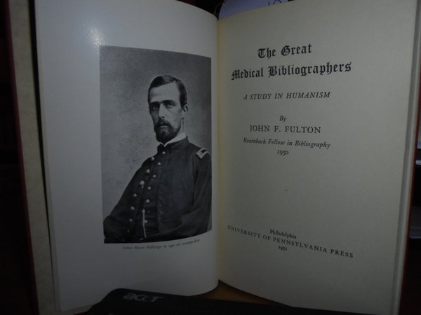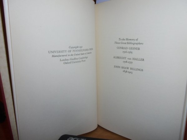 by JOHN, F. FULTON Rosenbach Fellow i Bibliography 1950. Philadelphia, University of Pennsylvania Press, 1951. The great medical bibliographers a Study in Humanism. In-8° piccolo, tela edit. rossa con titolo al dorso. xv, 107 pp. con 37 figure in tavole fuori testo. In ottimo stato di conservazione. Uff. C - IV - 4 - 2