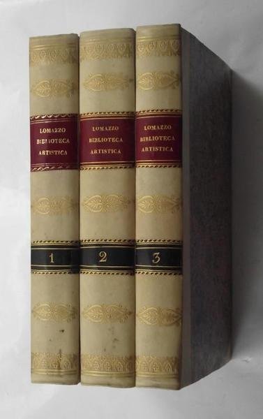 Tre volumi di cm. 22, pp. xviii (2) 424; 528; 379 (1). Solida legatura del tempo in mezza pergamena con piccole punte. Dorsi lisci con fregi in oro e titoli su doppio tassello bicolore. Solo qualche lieve fioritura, peraltro esemplare fresco ed in eccellente stato di conservazione, impreziosito da una legatura assai decorativa. Ottima edizione di quello che si deve considerare il più ampio e celebre trattato del manierismo, pubblicato originariamente a Milano nel 1584. Possiede inoltre un notevole interesse storico per le numerose e diffuse notizie sulla vita artistica milanese del periodo precedente. Si possono citare le notizie su Gaudenzio Ferrari e sui più antichi pittori e prospettici milanesi come Foppa, Zenale, Bramantino di cui l'autore possedeva scritti originali (oggi perduti) dei quali ci da dei compendi. Cfr. Schlosser Magnino, pp. 395 e segg.