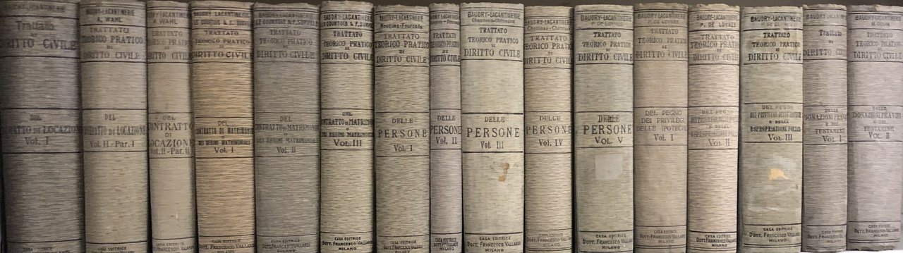 Trattato teorico pratico di diritto civile. Dei Beni; Volume unico con appendice del Prof. Pietro Bonfante. Dei contratti aleatori, del mandato, della fideiussione e della transazione; Con addizioni dei Professori V. Campogrande e G. Pacchioni. Del contratto di locazione; Con appendice di Ludovico Barassi; Vol. I; Vol. II parte I; Vol. II parte II. Del contratto di matrimonio o dei regimi matrimoniali; Con appendici dei Prof. B. Dusi e Dr. Fr. Ercole; Vol. I; Vol. II; Vol. III. Del pegno, dei privilegi, delle ipoteche e della espropriazione forzata; Con addizione del Prof. Luigi Sertorio; Vol. I; Vol. II; Vol. III. Della prescrizione; Terza edizione con aggiunte di Gino Segré. Della società, del mutuo, del deposito; Con addizione di | Libros antiguos y modernos | Baudry Lacantinerie Gabriel (Con La Collaborazione Di: Barde, Ch, Auveau, Chéneaux, Colin, Houques-Fourcade, Le Cortois, De Loynes, , Saignat, Surville, Tissier, Wahl)