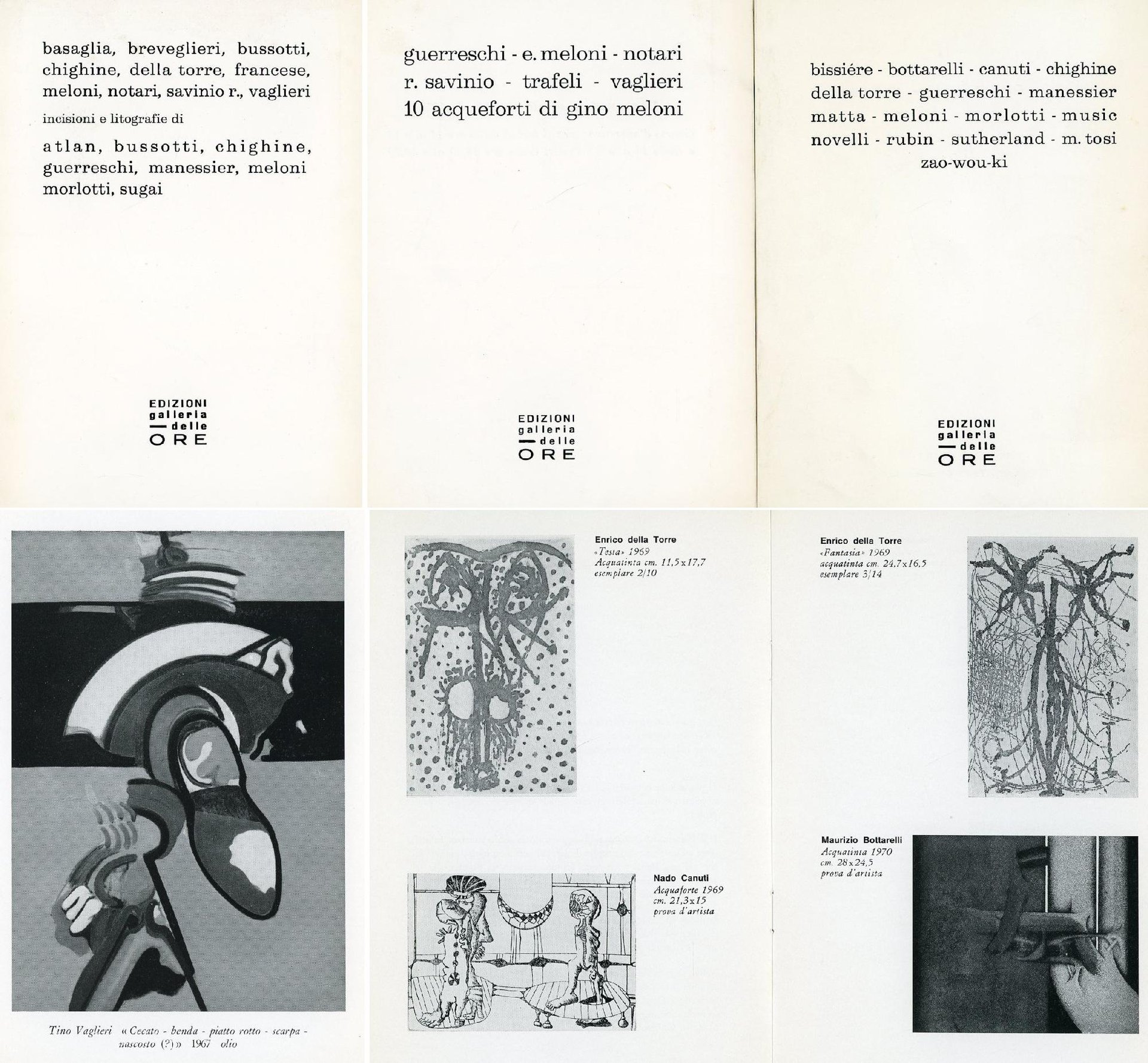 Tre cataloghi della Gallerie Le Ore, Milano 1968 - 1970. Opre di Guerreschi, Notari, Savinio, Meloni, Breviglieri, Chighine, Della Torre, Manessier ed altri. Illustrazioni in bianco e nero . 16mo. pp. 16 - 12 - 20. . Ottimo (Fine). . . .