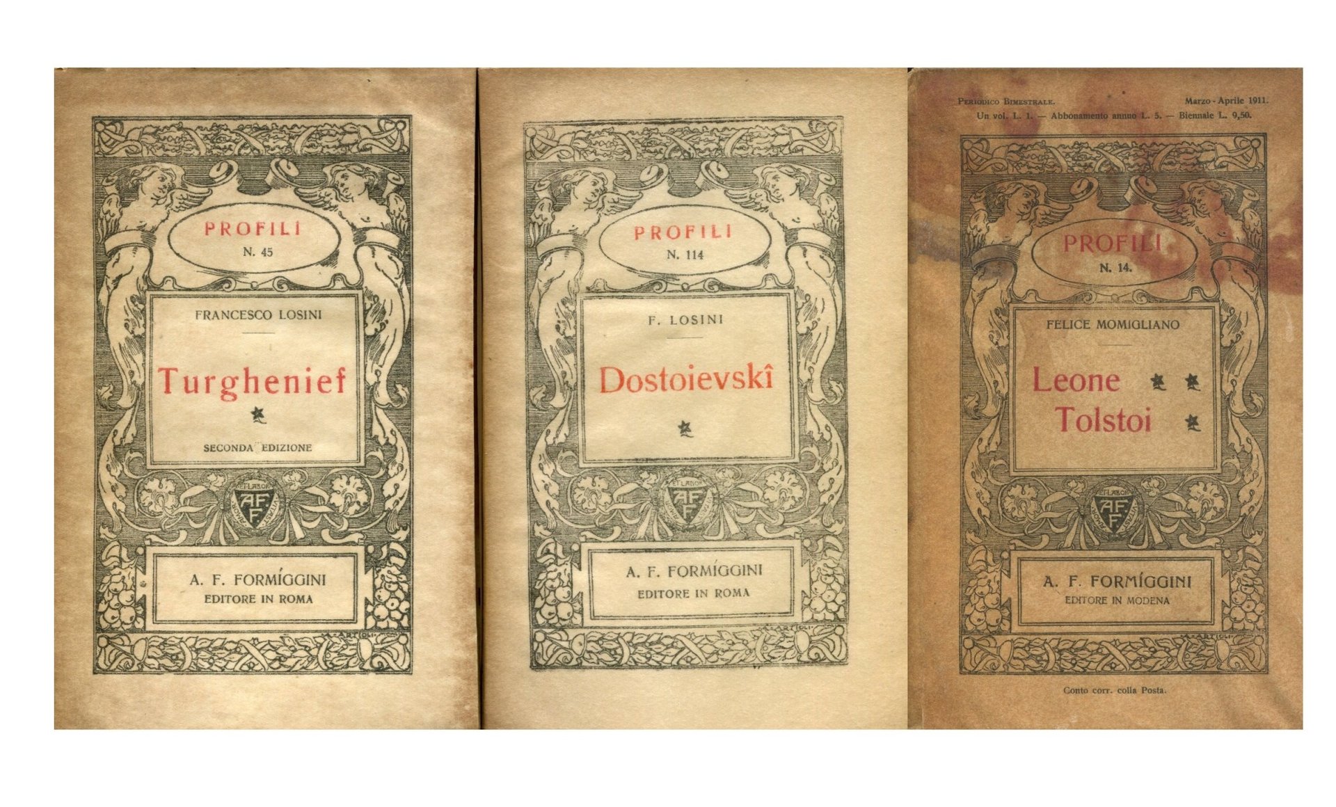 Un ritratto in bianco e nero in antiporta . 16mo. pp. 88. . Molto buono (Very Good). . Seconda edizione (2nd Edition). . Si allegano due libri dell'editore Formiggini, collana Profili: Francesco LOSINI, F.M. Dostoievski (1931. Pagine 84) - Felice MOMIGLIANO, Leone Tolstoj (1911. Pagine 82. Copertina leggermente macchiata). In buone condizioni
