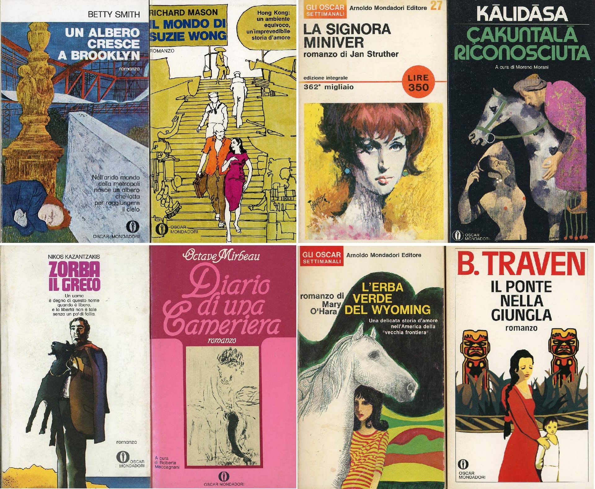 Traduzione di Giacomo Cicconardi . 16mo. pp. 486. . Ottimo (Fine). . . . Si aggiungono altri 7 romanzi della stessa collana Oscar Mondadori: Nikos Kazantzakis, Zorba il greco, 1973; 2) Mary O'Hara, L'erba verde del Wyoming, 1968; 3) Jan Struther, La signora Miniver, 1965; 4) Kalidasa, Cakuntala riconosciuta (Dramma in sette atti), 1982; 5) Richard Mason, Il mondo di Suzie Wong, 1973; 6) B. Traven, Il ponte nella giungla, 1981; 7) Octave Mirbeau, Diario di una cameriera, 1982