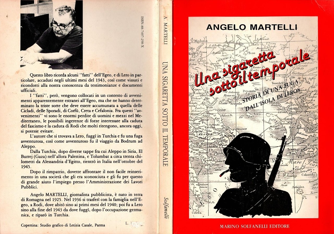 UNA SIGARETTA SOTTO IL TEMPORALE Storia di una fuga dall'isola di Leros di Angelo Martelli. Solfanelli Editore, 1988 . 192 pagine, numerose fotografie in bianco e nero e a colori nel testo. Copertina editoriale in brossura. Stato di conservazione: molto buono (pagine normalmente ingiallite) Libro usato saggistica