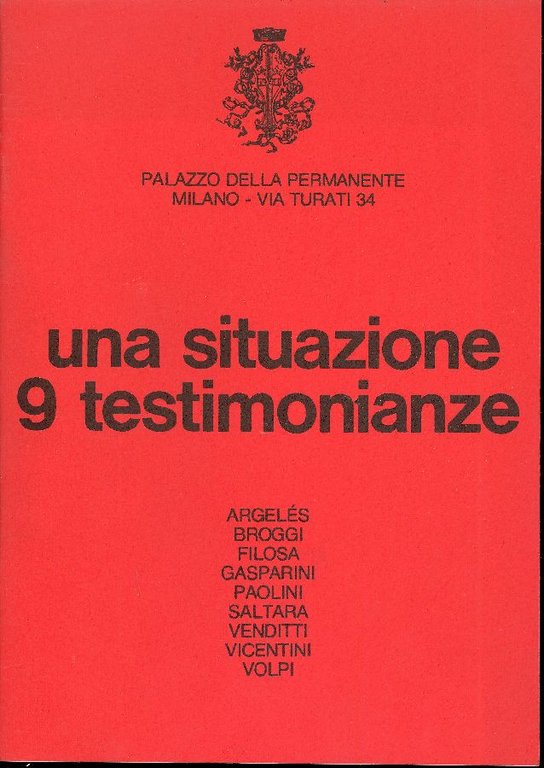 Catalogo di mostra, Milano, Palazzo della Permanente 21 febbraio - 19 marzo 1978. Gli artisti: Argelés, Broggi, Filosa, Gasparini, Paolini, Saltara, Venditti, Vicentini, Volpi. Biografie. Testi degli artisti. Ill. in bianco e nero . 8vo. pp. 24. . Ottimo (Fine). . . .