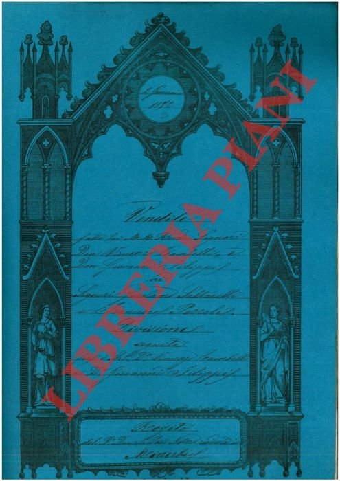 Minerbio, 1872, gennaio , rogito originale di 16 pp. in cartella con bella cornice xilografica, timbro a secco, firma del notaio Daniele Pasi di Minerbio