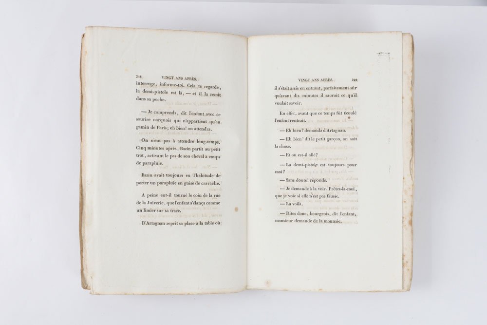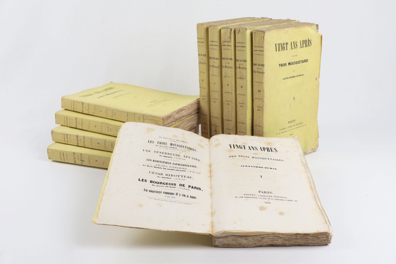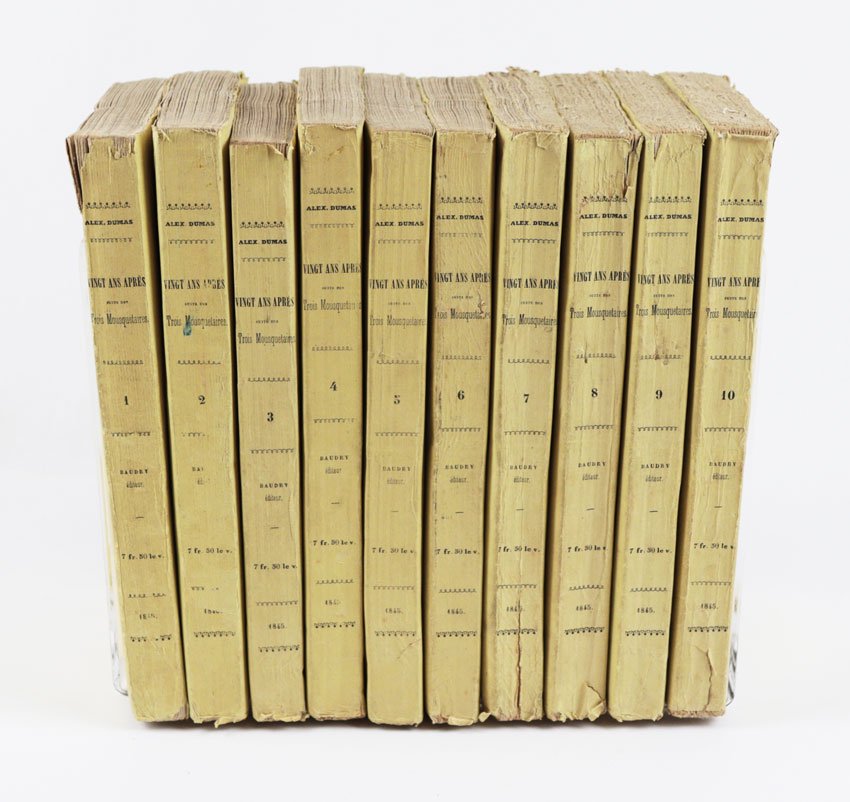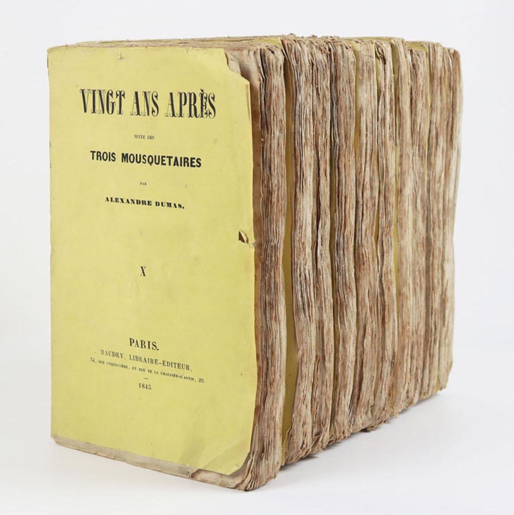 LIBROEdizione originale.Bellissimo esemplare nelle originali brossure di color giallo, in barbe; i volumi I–VI intonsi. Estremamente raro, nelle condizioni del presente esemplare. Il secondo romanzo della «Trilogia dei moschettieri» fu scritto in pochissimi mesi, sull’onda del clamoroso successo editoriale di «Les Trois mousquetaires» (1844): le avventure di D’Artagnan, Aramis, Athos e Porthos divennero subito un classico, e nel corso del tempo hanno travalicato la sfera letteraria per entrare nell’immaginario collettivo europeo. L’edizione originale di Baudry fu affiancata, e in qualche caso di poco preceduta, da una fitta selva di edizioni pirata stampate in Belgio e recanti data Bruxelles 1845; basti ricordare, tra le molte, Meline-Cans et C.ie, Alph. Lebègue et Sacré Fils e la Société Belge de Librairie. Tali editori procedevano a impaginare il testo traendolo direttamente dal giornale «Le siècle», sui cui il romanzo usciva a puntate, e a conclusione della serie ebbero buon gioco nel pubblicare le loro edizioni — sempre in più volumi ma di formato assai modesto — in anticipo su Baudry, che aveva invece attesa la revisione del testo da parte del suo autore. Dumas, infatti, nel passaggio dal feuilleton all’edizione originale, apportò al romanzo significative correzioni, tagli e aggiunte, così che il testo definitivo risulta molto distante da quello riprodotto in fretta e furia nei volumetti brussellesi. Queste edizioni pirata, pochissimo note fino al pionieristico lavoro di Douglas Munro (1981), appaiono oggi, alle soglie del secondo millennio, decisamente più comuni rispetto all’originale parigino. «Vingt ans après» è notoriamente più raro dei «Trois mousquetaires»: lo notava già nel 1924 il libraio e bibliografo Louis Carteret, descrivendo assai sommariamente l’edizione e chiosando con un laconico «Cet ouvrage est très rare». E se è vero che alcune di queste valutazioni di rarità, tramandate negli storici repertori bibliografici, fanno oggi sorridere, dal momento che titoli un tempo rari divengono di anno in anno più comuni, nel caso di «Vingt ans après» è semmai vero il contrario: una scrupolosa ricerca nei principali repertori online ha consentito di rintracciarne solo due copie in sedi istituzionali, una alla Bibliothèque nationale de France e una alla Pierpont Morgan Library di New York. Ed entrambe sono rilegate. Alla stessa stregua, l’edizione risulta rarissima sul mercato: negli ultimi sessant’anni si sono registrate solo quattro apparizioni in asta (mai in brossura, e per due volte insieme a «Les Trois mousquetaires») e due in cataloghi di vendita. Manca a collezioni private molto prestigiose, come quella, straordinaria, di Pierre Bergé (1930-2017), venduta all’incanto in più tornate a partire dal 2015: il milionario francese, compagno dello stilista Yves Saint Laurent e bibliofilo vorace e raffinato, si era dovuto accontentare di una delle edizioni brussellesi. In questo quadro, «Vingt ans après» risulta incomparabilmente più raro di «Les Trois mousquetaires», e paragonabile, piuttosto, al «Compte de Monte-Christo» — la cui unica apparizione in asta, Christie’s Paris 2010, ha finito per scrivere, con la sua aggiudicazione record, un pezzo di storia del mercato antiquario.Bibl.: G. Vicaire, Manuel de l’amateur de Livres du xixe siècle III (Paris 1897), col. 368-s; L. Carteret, Le Trésor du bibliophile romantique et moderne I (Paris 1924), p. 236; H. Talvart & J. Place, Bibliographie des auteurs modernes de langue française V (Paris 1935), p. 14, n. 72.a; F. W. Reed, A Bibliography of Alexandre Dumas père (London 1933); D. Munro, Alexandre Dumas père: A Bibliography (New York 1981)