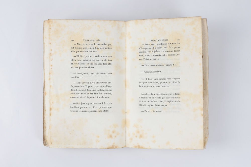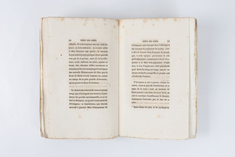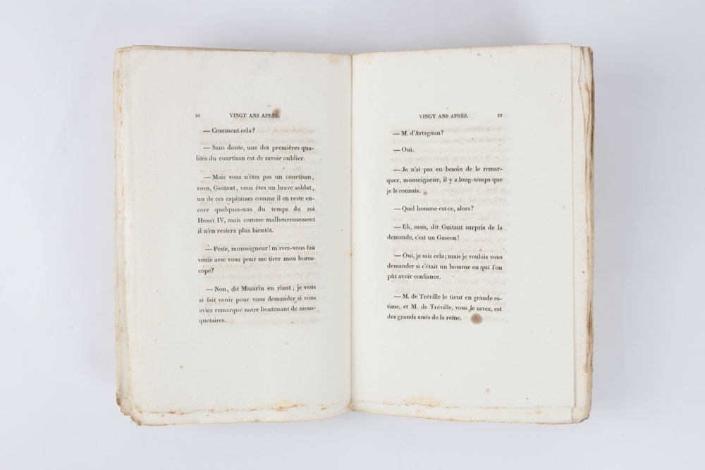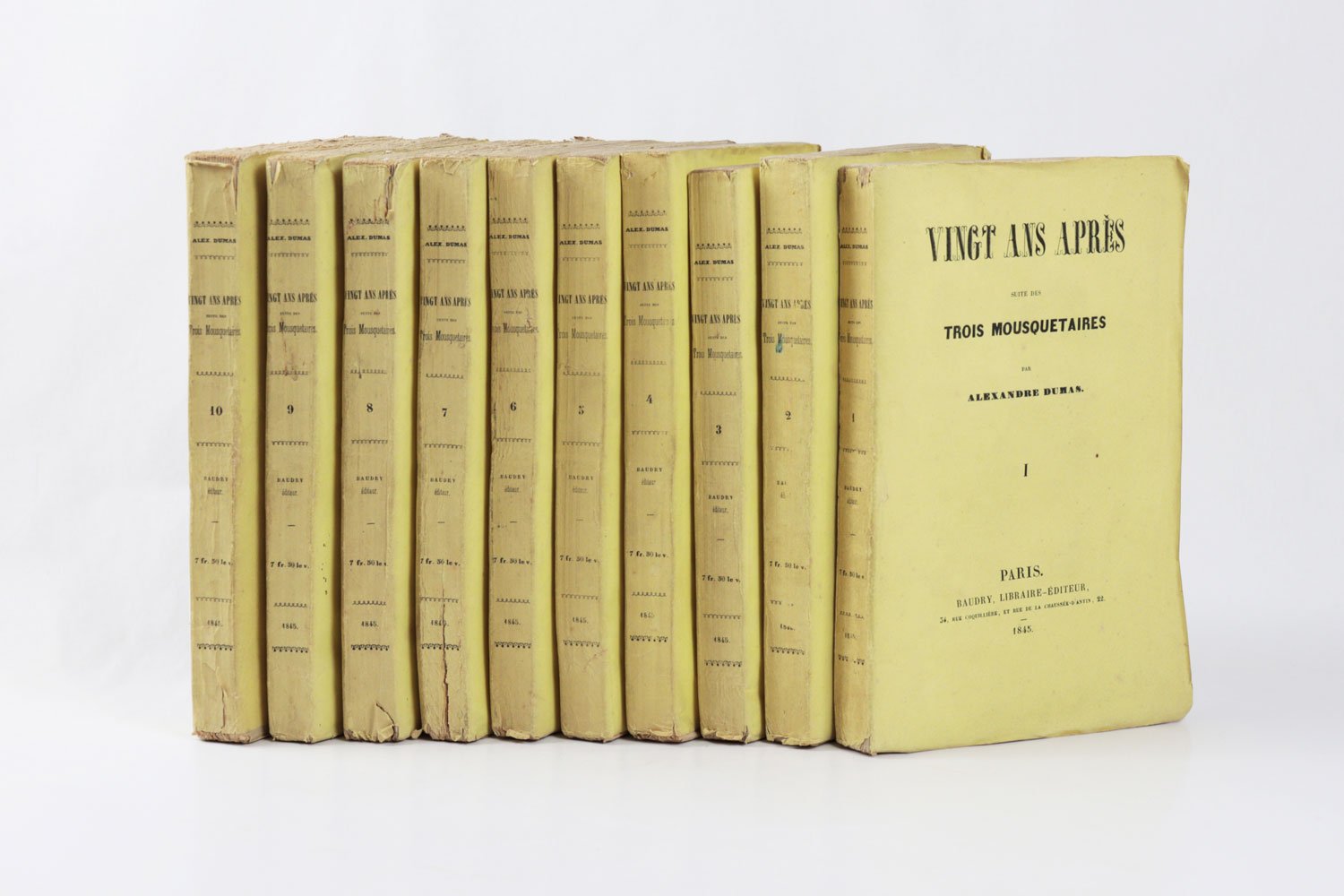 LIBROEdizione originale.Bellissimo esemplare nelle originali brossure di color giallo, in barbe; i volumi I–VI intonsi. Estremamente raro, nelle condizioni del presente esemplare. Il secondo romanzo della «Trilogia dei moschettieri» fu scritto in pochissimi mesi, sull’onda del clamoroso successo editoriale di «Les Trois mousquetaires» (1844): le avventure di D’Artagnan, Aramis, Athos e Porthos divennero subito un classico, e nel corso del tempo hanno travalicato la sfera letteraria per entrare nell’immaginario collettivo europeo. L’edizione originale di Baudry fu affiancata, e in qualche caso di poco preceduta, da una fitta selva di edizioni pirata stampate in Belgio e recanti data Bruxelles 1845; basti ricordare, tra le molte, Meline-Cans et C.ie, Alph. Lebègue et Sacré Fils e la Société Belge de Librairie. Tali editori procedevano a impaginare il testo traendolo direttamente dal giornale «Le siècle», sui cui il romanzo usciva a puntate, e a conclusione della serie ebbero buon gioco nel pubblicare le loro edizioni — sempre in più volumi ma di formato assai modesto — in anticipo su Baudry, che aveva invece attesa la revisione del testo da parte del suo autore. Dumas, infatti, nel passaggio dal feuilleton all’edizione originale, apportò al romanzo significative correzioni, tagli e aggiunte, così che il testo definitivo risulta molto distante da quello riprodotto in fretta e furia nei volumetti brussellesi. Queste edizioni pirata, pochissimo note fino al pionieristico lavoro di Douglas Munro (1981), appaiono oggi, alle soglie del secondo millennio, decisamente più comuni rispetto all’originale parigino. «Vingt ans après» è notoriamente più raro dei «Trois mousquetaires»: lo notava già nel 1924 il libraio e bibliografo Louis Carteret, descrivendo assai sommariamente l’edizione e chiosando con un laconico «Cet ouvrage est très rare». E se è vero che alcune di queste valutazioni di rarità, tramandate negli storici repertori bibliografici, fanno oggi sorridere, dal momento che titoli un tempo rari divengono di anno in anno più comuni, nel caso di «Vingt ans après» è semmai vero il contrario: una scrupolosa ricerca nei principali repertori online ha consentito di rintracciarne solo due copie in sedi istituzionali, una alla Bibliothèque nationale de France e una alla Pierpont Morgan Library di New York. Ed entrambe sono rilegate. Alla stessa stregua, l’edizione risulta rarissima sul mercato: negli ultimi sessant’anni si sono registrate solo quattro apparizioni in asta (mai in brossura, e per due volte insieme a «Les Trois mousquetaires») e due in cataloghi di vendita. Manca a collezioni private molto prestigiose, come quella, straordinaria, di Pierre Bergé (1930-2017), venduta all’incanto in più tornate a partire dal 2015: il milionario francese, compagno dello stilista Yves Saint Laurent e bibliofilo vorace e raffinato, si era dovuto accontentare di una delle edizioni brussellesi. In questo quadro, «Vingt ans après» risulta incomparabilmente più raro di «Les Trois mousquetaires», e paragonabile, piuttosto, al «Compte de Monte-Christo» — la cui unica apparizione in asta, Christie’s Paris 2010, ha finito per scrivere, con la sua aggiudicazione record, un pezzo di storia del mercato antiquario.Bibl.: G. Vicaire, Manuel de l’amateur de Livres du xixe siècle III (Paris 1897), col. 368-s; L. Carteret, Le Trésor du bibliophile romantique et moderne I (Paris 1924), p. 236; H. Talvart & J. Place, Bibliographie des auteurs modernes de langue française V (Paris 1935), p. 14, n. 72.a; F. W. Reed, A Bibliography of Alexandre Dumas père (London 1933); D. Munro, Alexandre Dumas père: A Bibliography (New York 1981)