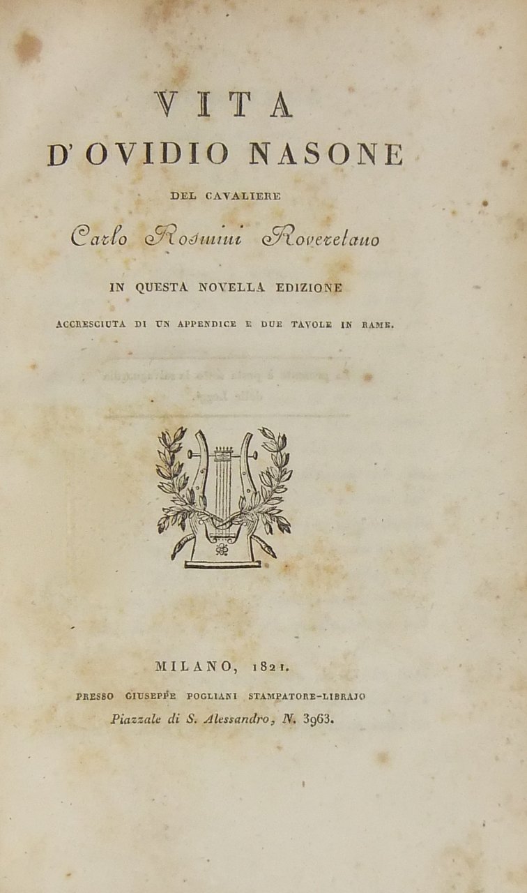 Vita d'Ovidio Nasone del cavaliere Carlo Rosmini Roveretano. In questa novella edizione accresciuta di un'appendice e due tavole in rame