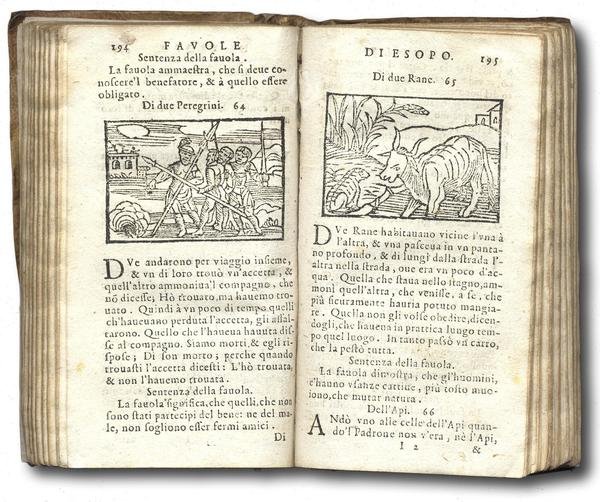 in-12, (130x75 mm), pp. 413, (15), legatura coeva in piena pergamena floscia. Con due frontespizi figurati e 147 vignette (di mm 35x50 ca.) silografiche n.t., alcune più volte ripetute, iniziali ornate e finalini. Pregevole edizione della Vita e delle Favole di Esopo nella traduzione italiana a cura del piacentino Giulio Landi, apparse rispettivamente per la prima volta presso i Giolito nel 1545, e a Venezia, Bariletto, 1569 (DBIt 63, pp. 385-389). Edizione figurata di eccezionale rarità - come tutte quelle di Esopo, di estrema deperibilità in quanto date in lettura ai bambini; nessun esemplare di questa edizione torinese è censito in biblioteche pubbliche italiane. Inoltre appare straordinario sottolineare che i legni sono gli stessi utilizzati nell'edizione latina apparsa a Biella presso Mondella nel 1549 e 1550 (Bersano Begey, II, 913-14). Queste deliziose matrici xilografiche, dall'indubbio sapore popolare, sopravvissero per oltre cento anni e vennero riutilizzate in questa edizione in volgare. Buon esemplare (antiche note di possesso ms. al titolo e in fine 'Gioanni Pietro Reynaudo'). Manca a Michel-Michel, a B.M.STC Italian XVII secolo, al Canavesio, Tipografia del 600 in Piemonte.