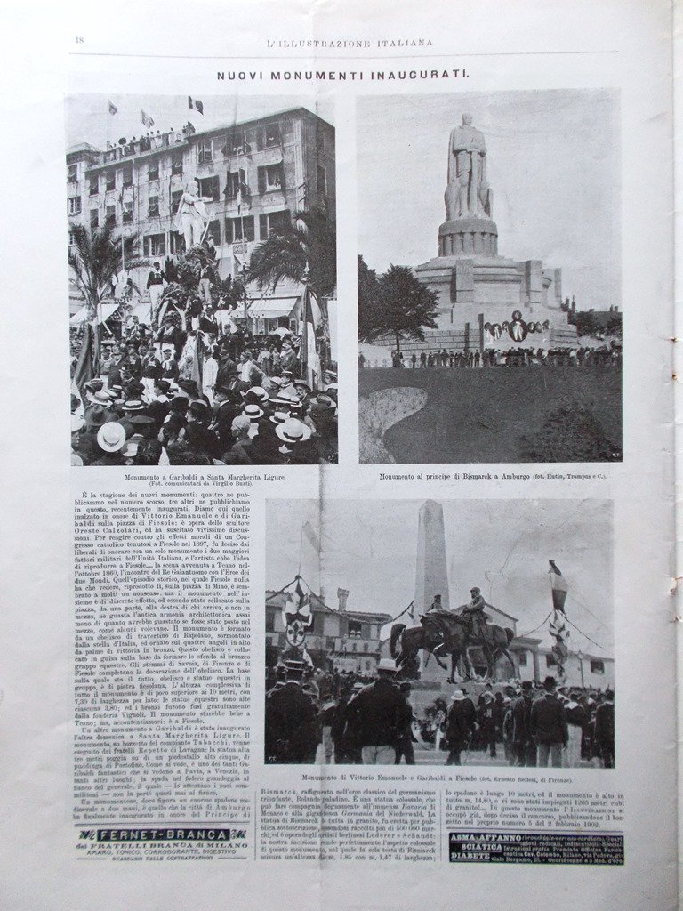 Nuovi monumenti inaugurati: a Garibaldi a Santa Margherita Ligure, al principe Bismarck ad Amburgo, a Vittorio Emanuele e Garibaldi a Fiesole