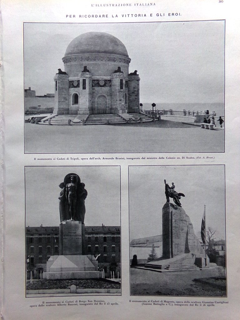 Per ricordare la vittoria e gli eroi: monumenti ai caduti di Tripoli (Armando Brasini), Borgo San Donnino (Alberto Bazzoni), Magenta (Giannino Castiglioni)