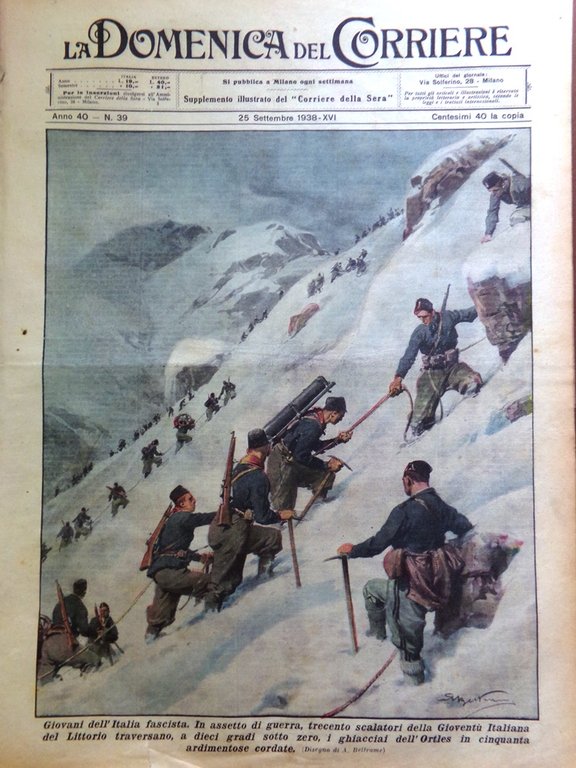 Giovani dell'Italia fascista. In assetto di guerra, trecento scalatori della Giovent Italiana del Littorio traversano, a dieci gradi sotto zero, i ghiacciai dell'Ortles in cinquanta ardimentose cordate (Achille Beltrame)