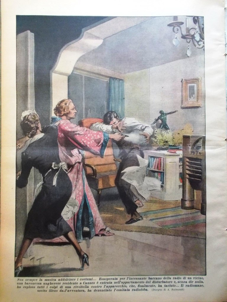 Non sempre la musica addolcisce i costumi.Esasperata per l'incessante baccano della radio di un vicino una baronessa ungherese residente a Cannes è entrata nell'appartamento del disturbatore e ha esploso tutti i colpi di una rivoltella contro l'apparecchio. E' stata denunciata (A. Raimondi)