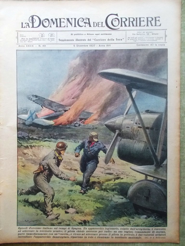 Eroismo italiano sui campi di Spagna. Un apparecchio legionario, colpito dall'artiglieria, è costretto ad atterrare in territorio nemico; il pilota chiede soccorso per radio: un suo cugino parte immediatamente con un "caccia" e riesce ad atterrare presso il pilota in pericolo. I due aviatori incendiano l'apparecchio danneggiato, ripartono in volo e rientrano (Achille Beltrame)